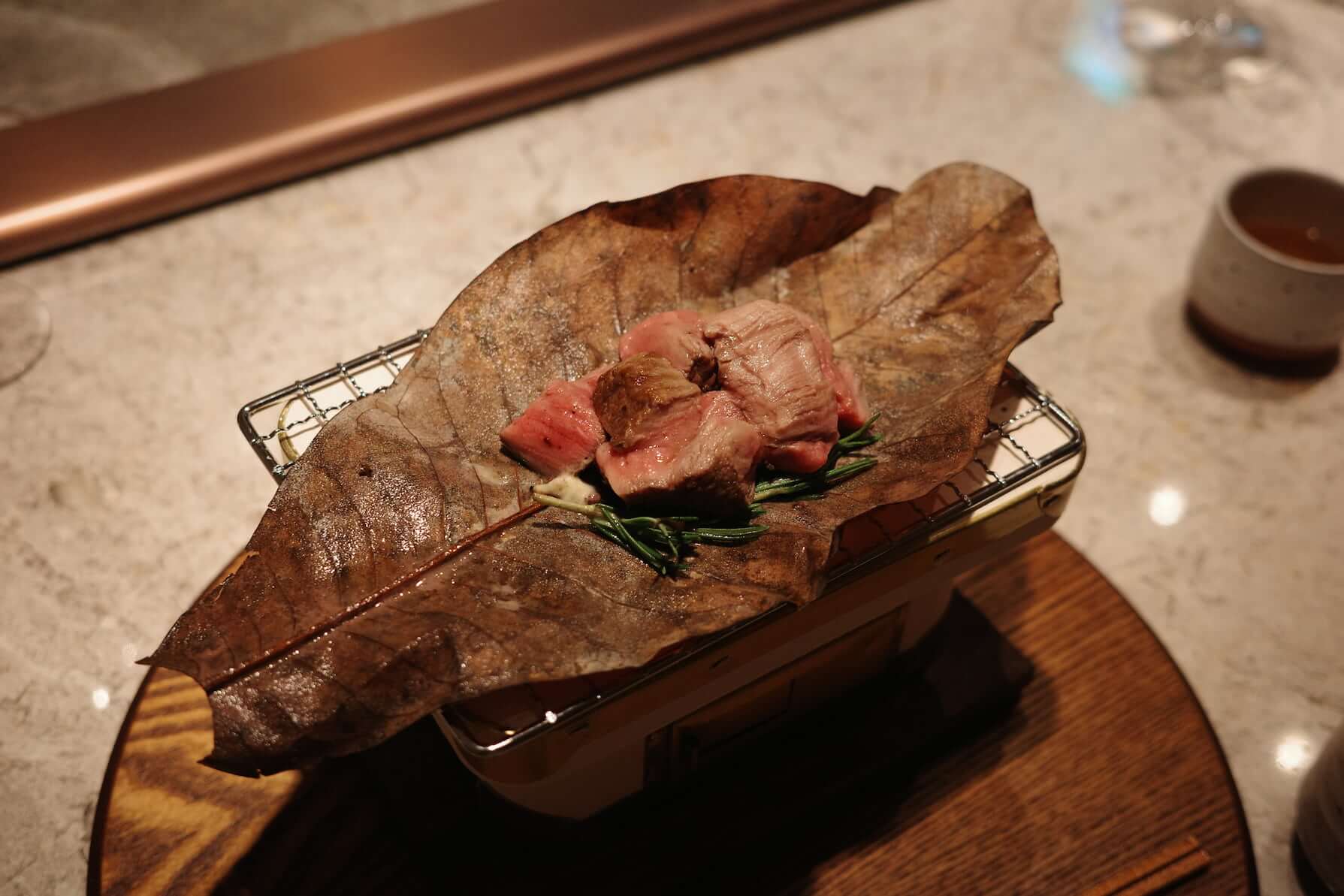 例如令人驚豔不已的「宮崎黑毛和牛|刺蔥|山椒|迷迭香」。以宮崎黑毛和牛菲力烤製朴葉燒,搭配迷迭香、刺蔥、山椒製成的焦化奶油,簡潔鮮明、力透紙背的調味,令熟度完美的頂級菲力更上一層,帶來一記完美的舌尖爆擊。