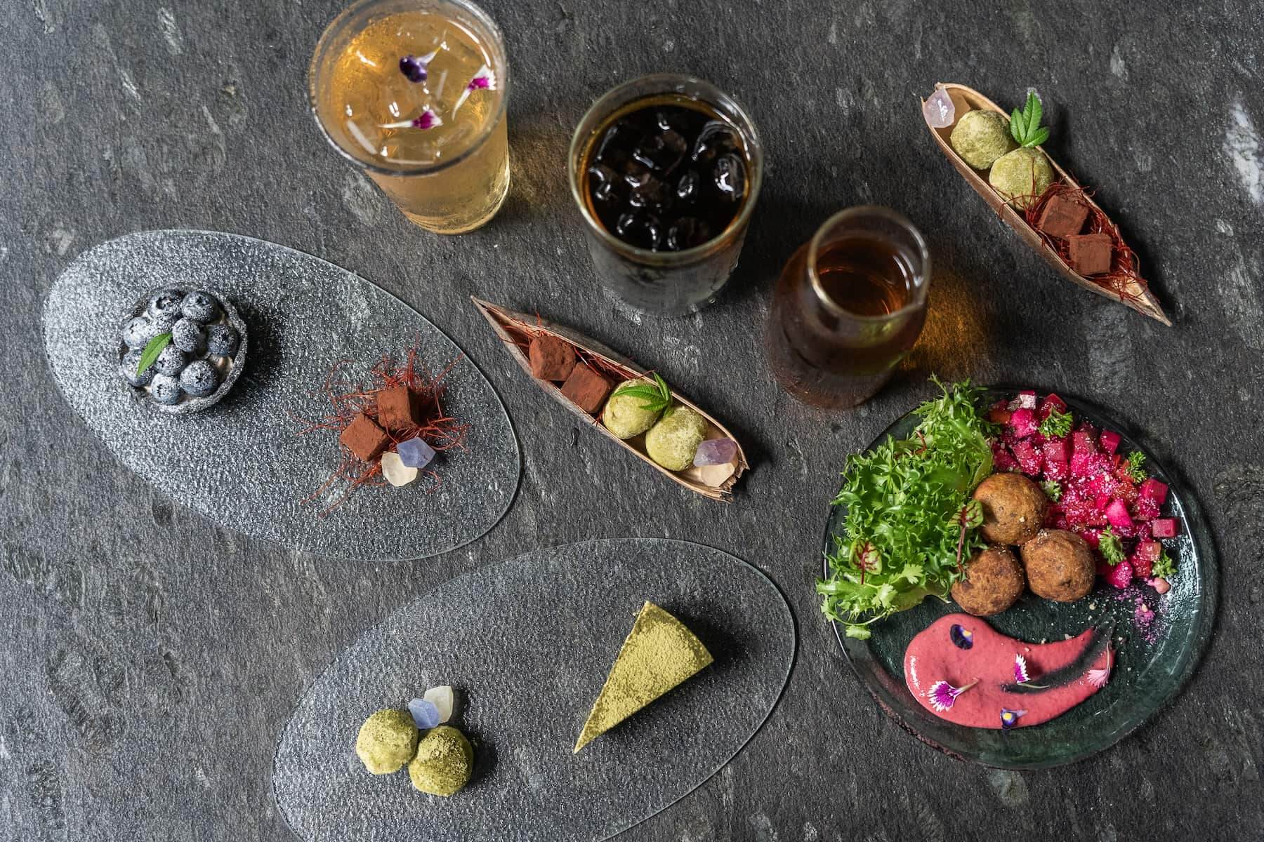 由無礦團隊設計並手工製作的礦食點心組,以純植物為基底的點心組佐一杯飲品,內含芳香生巧克力、煙燻辣椒生巧克力、春茶雪球餅乾與香草琥珀糖,繁複工序純手工製作,滿滿的能量補充作為旅程豐收結尾。