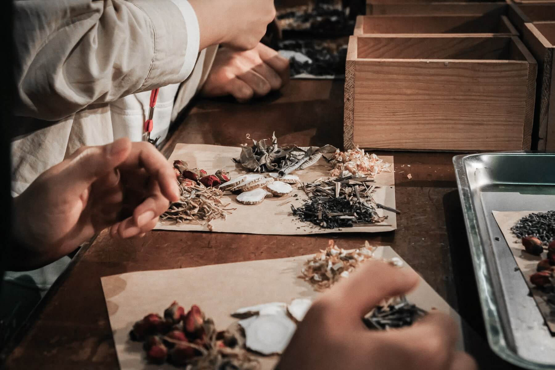 創立於1985年的漢方養生當代中藥行「登義」,在無礦搭建出百草櫃與掌櫃桌之間盈滿藥香的氛圍,經歷歲月時光的洗禮與沉澱,伴隨著掌櫃的聲音,帶領大家製作天然漢方—百花湯浴包乙份。
