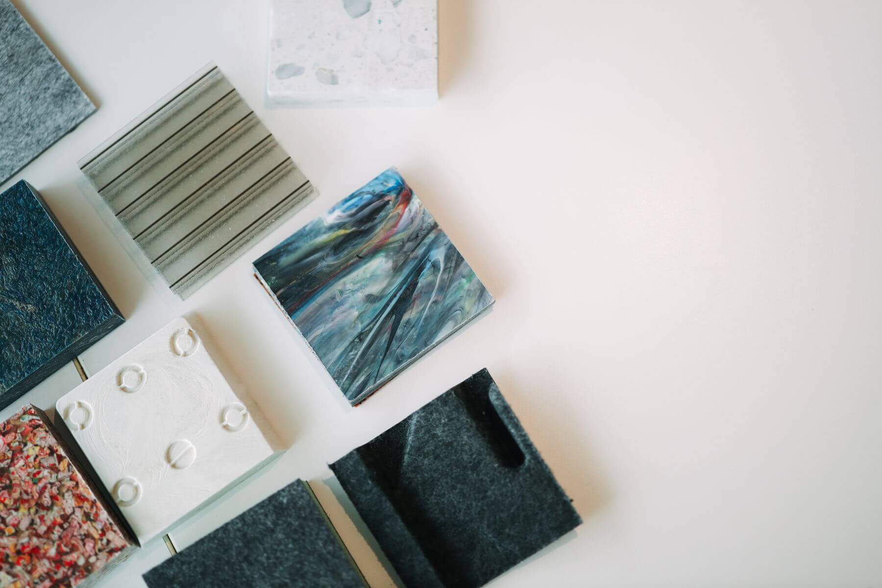 回收只是第一步,接著是繁複的處理、製程和設計,新的材料不僅要耐用,更要美觀。17年來,小智研發已開發超過1200種材料,每個材料各有特定用途,如防潑水、抗菌、防焰、透光,全是市面上找不到的獨家回收再製建材。