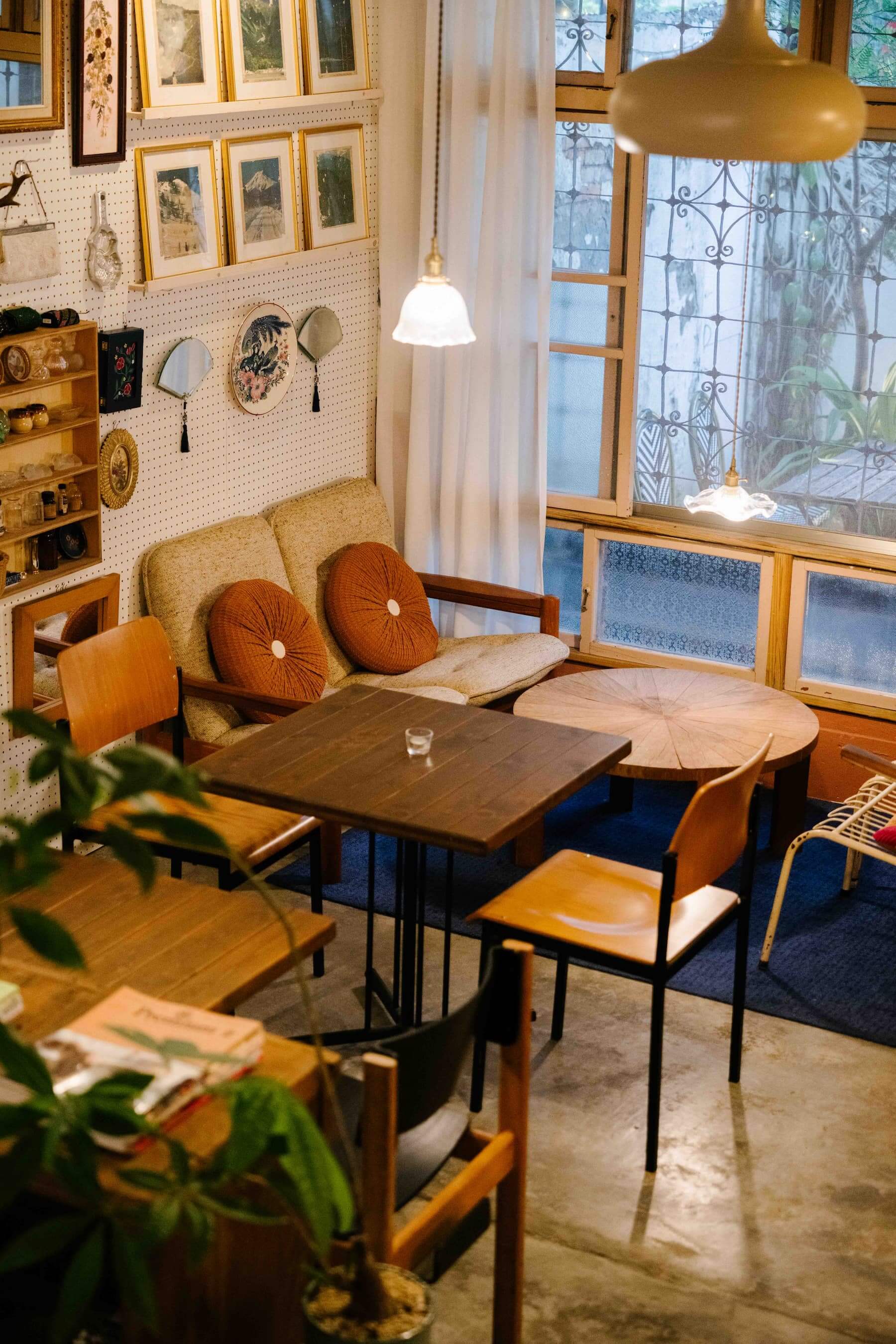 在進駐永和之前, 三層已先後落腳過三個不同的地方——南京三民、南京復興及大稻埕,並經歷了一年實體店關閉的慘況。直至2022年10月,在「棲仙陳設選物所」主理人Sophie的邀請下,來到永和探勘即將空出的一樓店面,「我看不到十分鐘就跟她說: 『我要租這邊!』」 April說,大面的落地窗讓這間老屋擁有非常通透的自然採光,而窗花、木框窗戶及磨石子地等復古元素,更將這個空間妝點得更加雅緻、舒服,「就是個讓人可以放鬆發呆的好地方。」