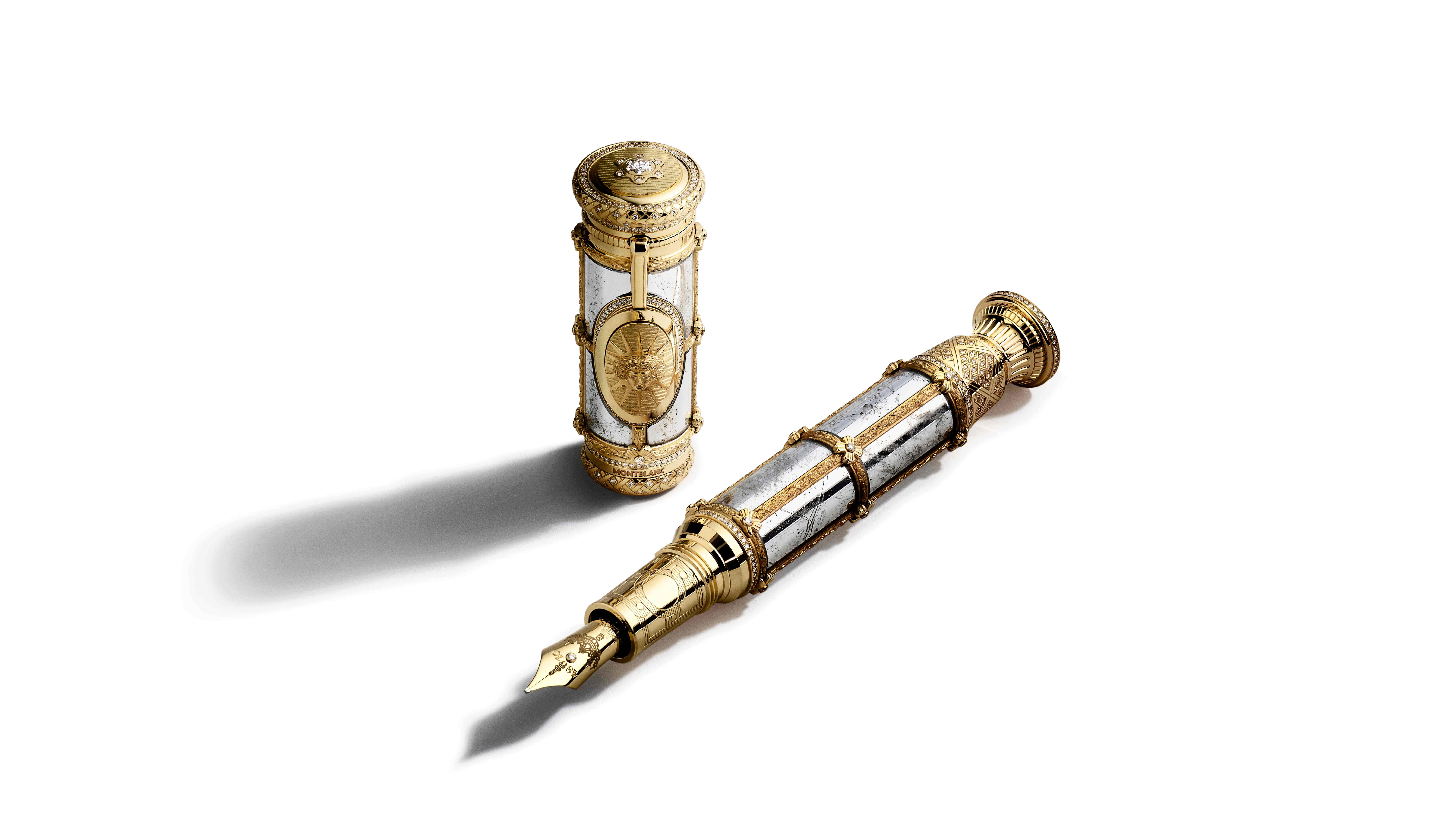 手工打造的Au 750純金筆尖鑲有一顆明亮式切割鑽石,重現了鏡廳華麗水晶吊燈的層層水晶所反射的光線。純金筆身前端上飾有鐫刻圖案,靈感源自宮殿內國王寢宮的大理石裝飾,鑲嵌鑽石的Au 750純金筆尾呈印章造型,特殊鐫刻呼應鏡廳幾何拼花地板圖案,底部刻有路易十四的印璽,這個威嚴的徽飾由兩個「L」字母組成,可用於封緘私人信函。筆蓋頂端藏有暗格,客戶可選擇刻上靈感源自偉大密碼系統的個人化密碼,使這款獨特的書寫工具成為專屬於自己的珍品。