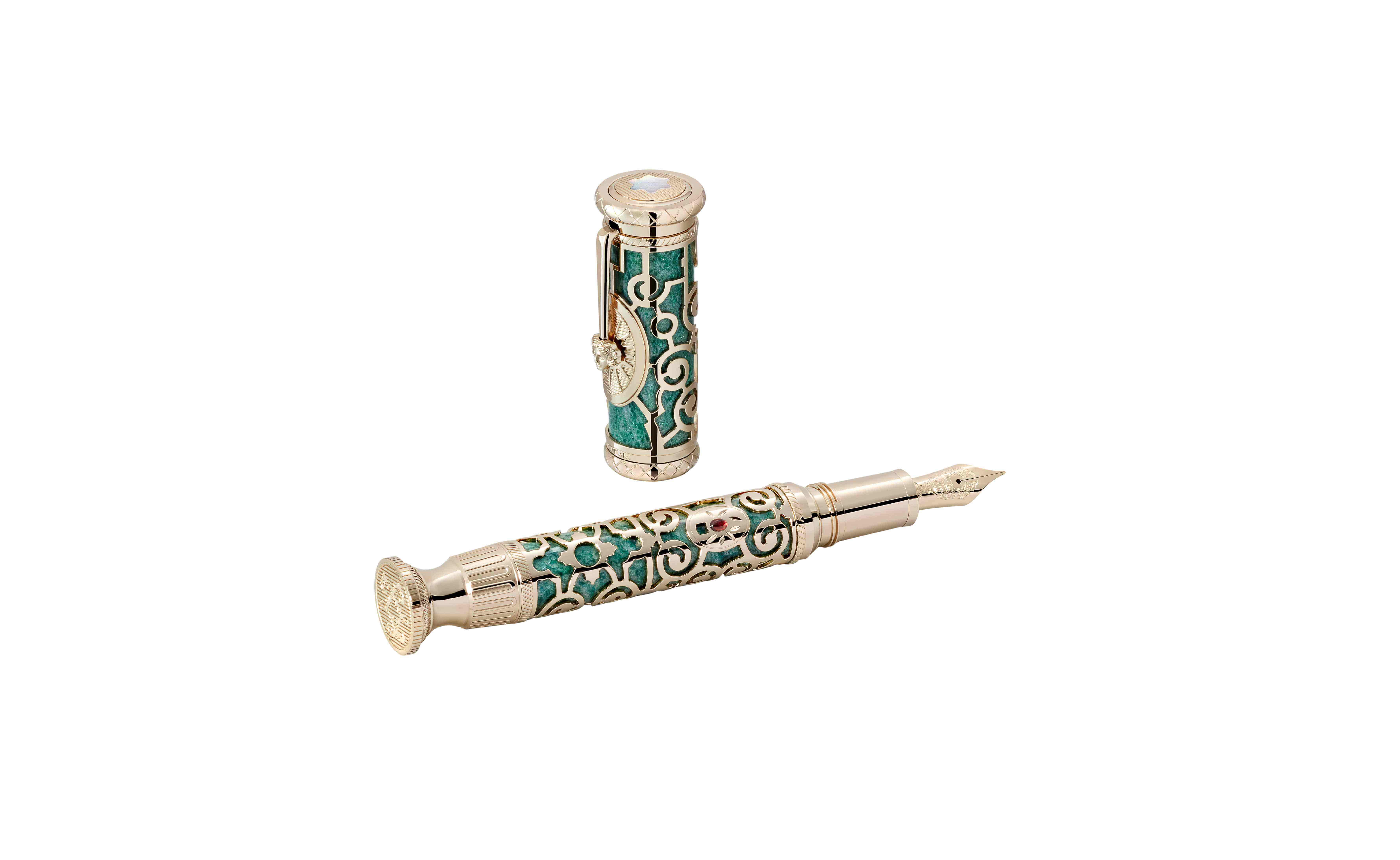 此筆款向凡爾賽宮著名的橘園(Orangeri)致敬,體現國王對秩序、美感與橘花香氣的熱愛。其設計借鑒了皇家花園的對稱佈局的圖案與配色,筆身外層以Au 750純金鏤空包覆,底層襯托著閃耀的綠色砂金石,筆身中央飾有一顆紅色蛋面切割石榴石,象徵顏⾊鮮豔的柑橘果實,周圍環繞著精細的花卉鐫刻。書寫工具的若干細節也使人想起橘園:筆尾圖案的靈感源自橘園的花瓶,手工打造的Au 750純金筆尖上的裝飾,則描繪了在夏季置於花壇邊緣、展示國王珍藏柑橘樹的經典花盆。