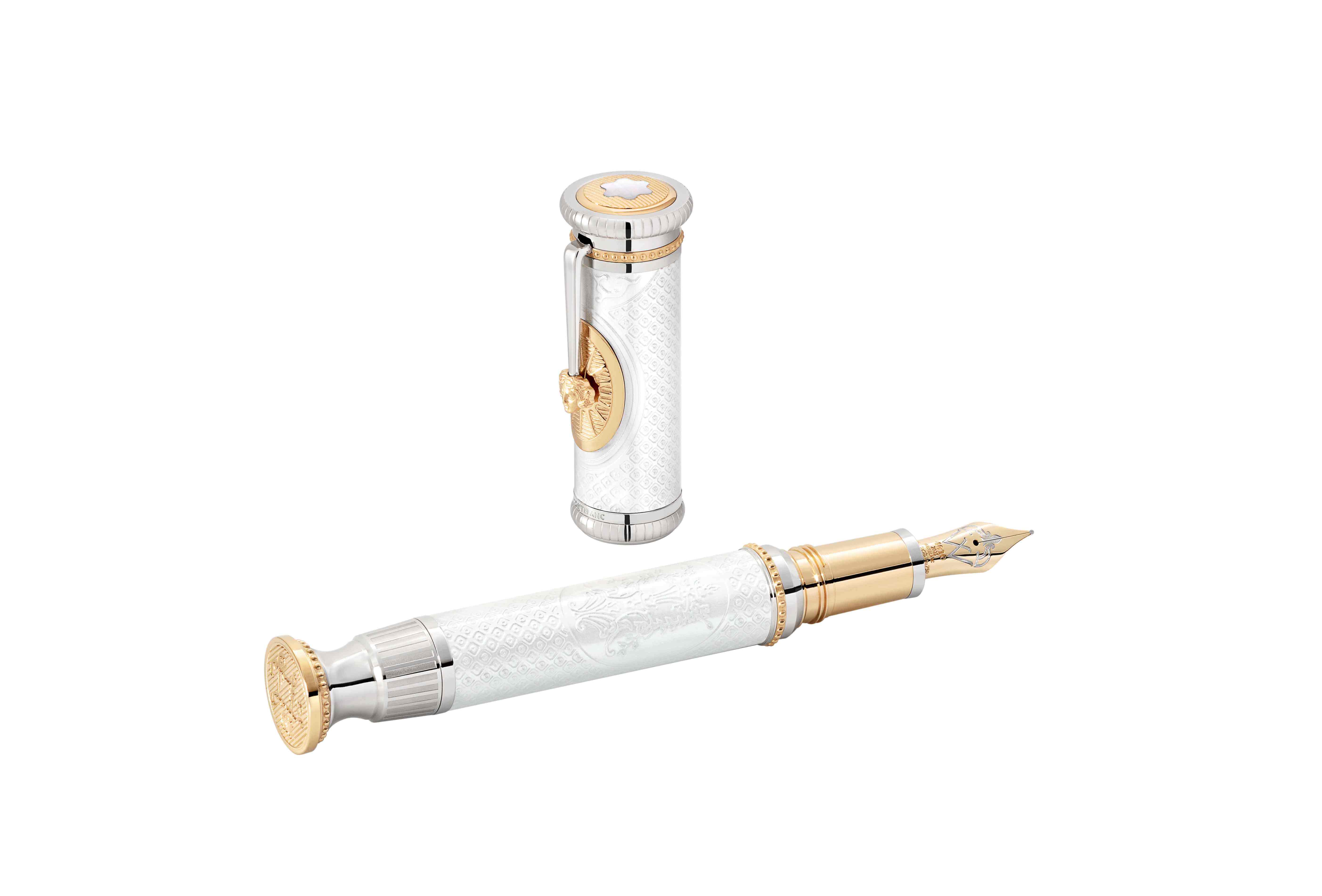 靈感源自路易十四於私人寓所中極盡奢華的國王寢宮,讓人想起路易十四私人世界的生活與優雅風格。筆身覆以白色半透明亮漆,宛如寢宮內靜謐的白牆,搭配Au 750純黃金與鍍鉑金細節,重現寢宮內精緻的鎏金裝飾。在半透明亮漆塗層之下,飾有精美圖紋,呼應房間內的洛可可風格的裝飾細節。筆蓋頂端飾有以珍珠母貝製作的MONTBLANC六角白星標誌,鑲嵌於Au 750純黃金之中。