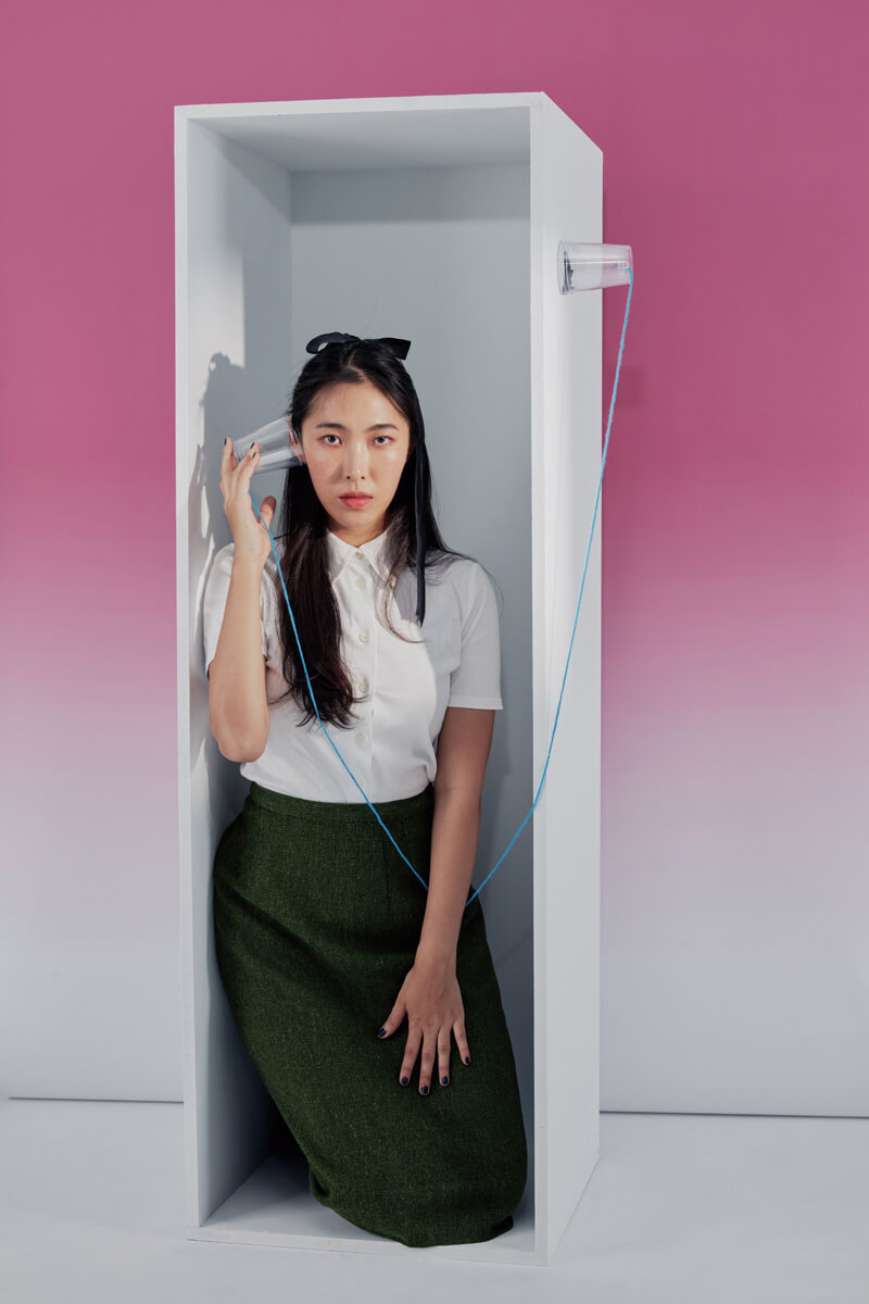 王若琳此次受邀擔任《VERSE》第二期封面人物,攝影師 Puzzleman Leung 特地為她量身打造三種視覺,呼應她的個性與這期的主題「聲音」,並利用隨手可得的素材製作小道具,分別是白精靈菇偽裝成的 AirPods、塑膠杯做成的電話筒,以及畫在紙版的耳機,散發出「低科技」與網路迷因的味道。