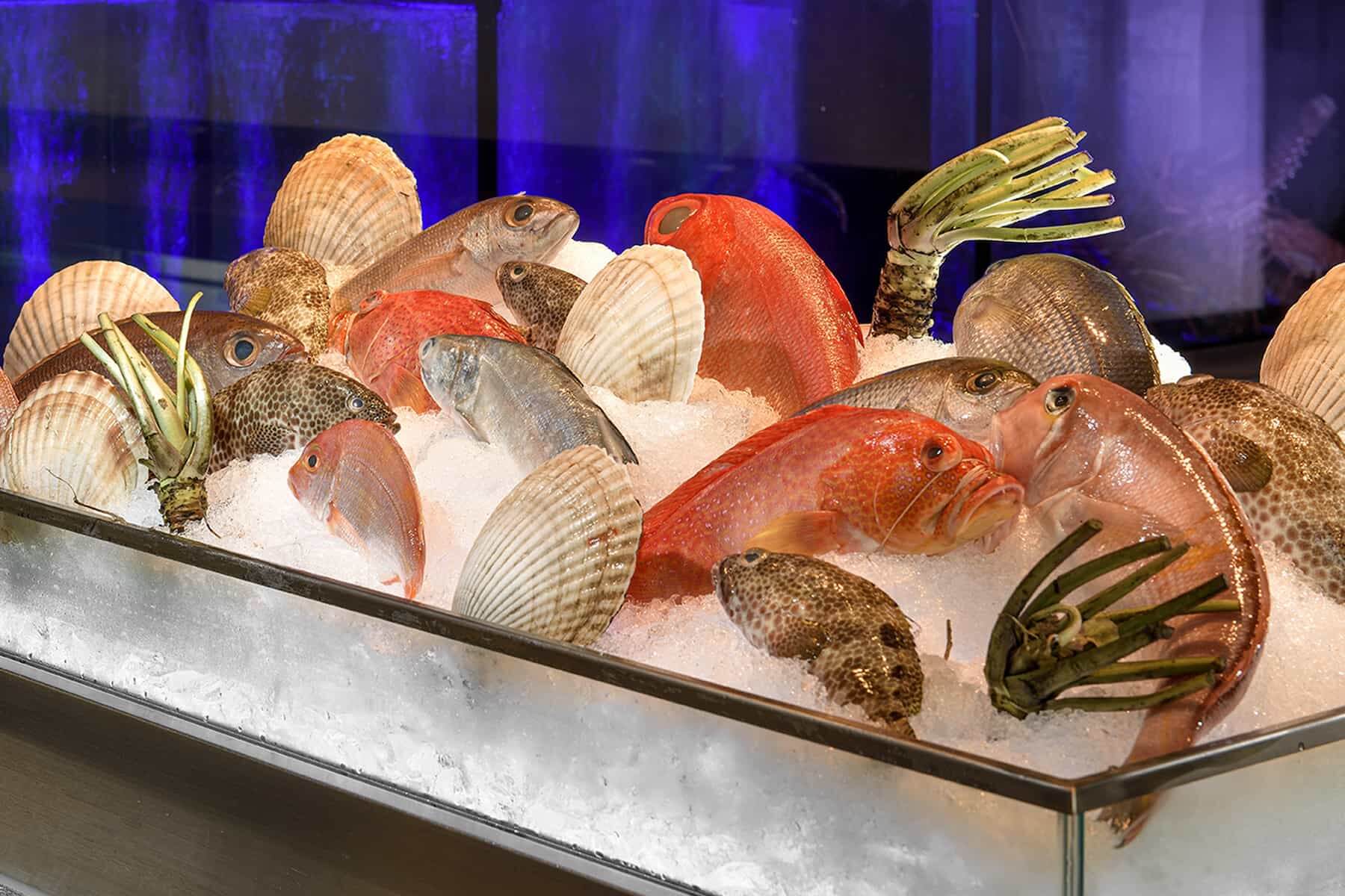 甫入岩彩,一共長3.1公尺的「大面水缸」映入眼簾,其中有帝王蟹、象拔蚌、沙公等頂級食材,水缸採嚴格控溫、分區照料的方式,確保活體海鮮品質。另外,餐廳亦規劃「海鮮檯」,每日有超過20種現流、活體海鮮輪番上陣,甚至有機會品嘗到珍稀海味,春夏時節推薦包含野生角魚、那個魚以及青雞,彰顯岩彩秉持「吃在地、食當旬」的料理哲學,運用大溪漁港及南方澳漁港直送的便捷優勢,以清蒸、乾煎與火烤等方式展現本味。