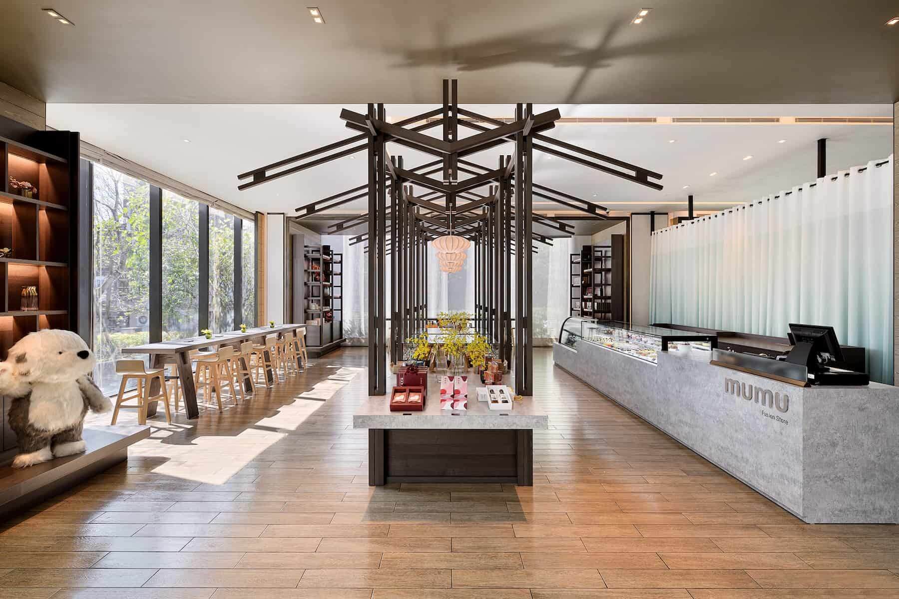 位於一樓的「沐選」伴手禮店則提供豐富精美的伴手禮及外帶美食餐點,包含烘焙糕點、冷凍食品、酒類飲品與零食雜貨等超過百項商品,最低優惠價格35元起;人氣商品為芒果啵啵、青檸伯爵麵包、莓莓乳酪麵包與千層吐司,另外有MU醬與MUMU醬的飲料杯套可供選擇。大面落地窗伴隨日光灑落,光影舞動營造悠閒的氛圍,讓貴賓輕鬆購物,將旅行的美味帶回家。