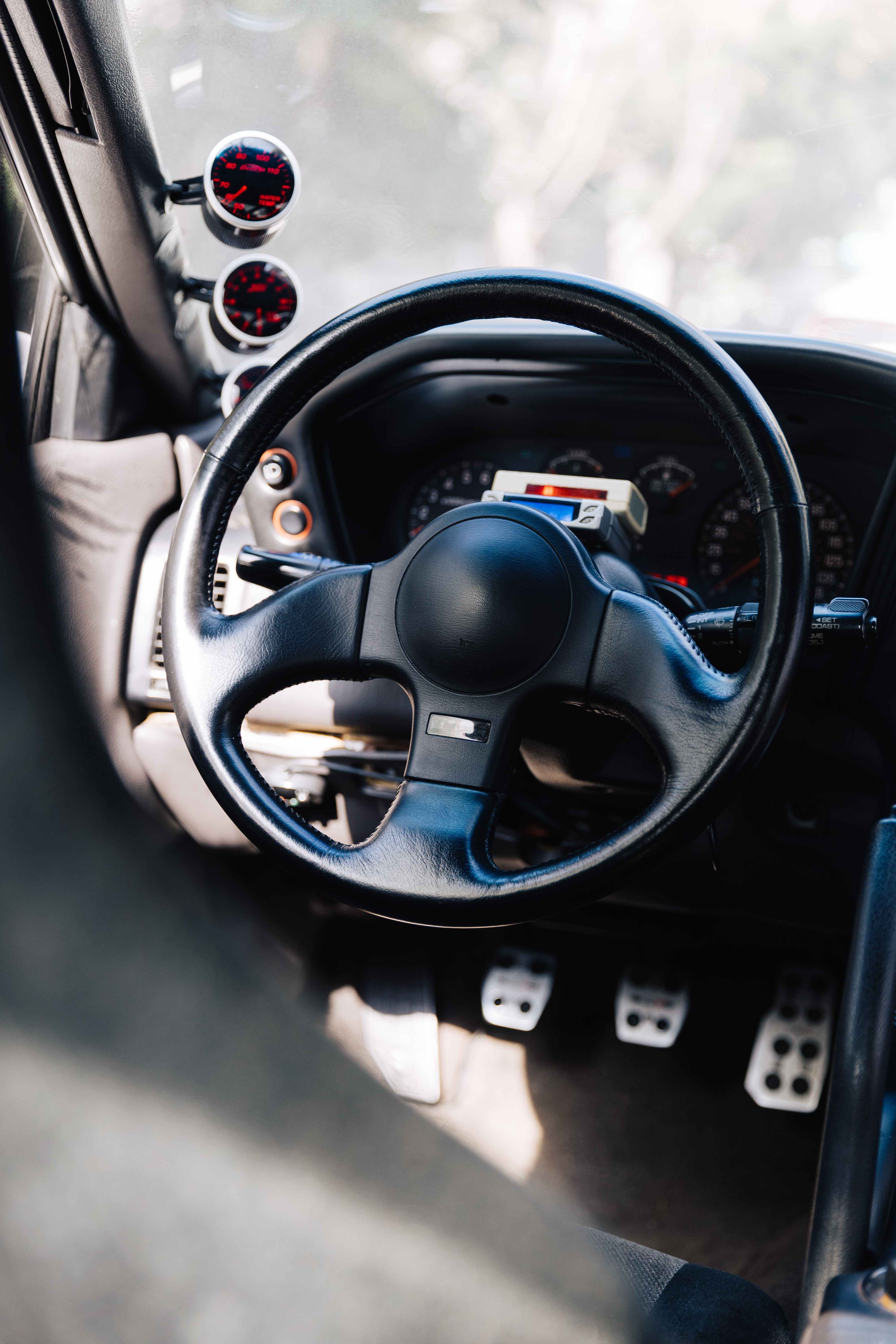 ❹ 方向盤|原車的方向盤有裸露鐵質、形象較為剛硬,彭昱凱換成三菱90年代的三幅式方向盤後,皮革與設計才原汁原味重現當年的迷人特點。