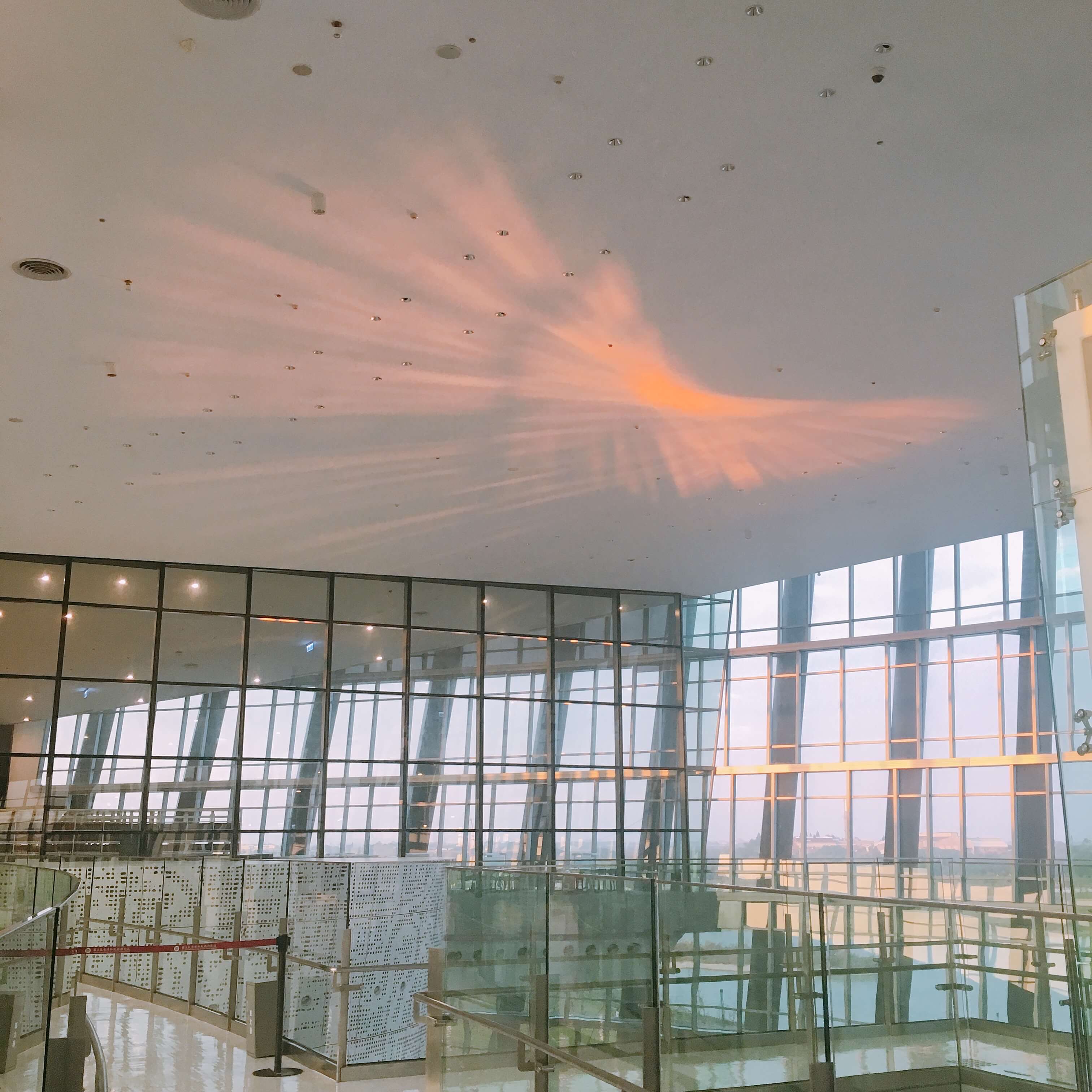 午後走進故宮南院2樓售票大廳,偶爾會在頭頂遇見一隻「漂亮金鳳凰」!它不是裝置藝術,而是太陽角度與嘉義南院建築玻璃窗反射出的光影奇景,隨日照在牆面滑移,金色光線勾勒出宛如鳳凰的羽翼輪廓。若想要碰碰運氣,晴朗午後是巧遇金鳳凰的最佳時段。透過尋找「金鳳凰」,也能好好欣賞南院的建築美學。