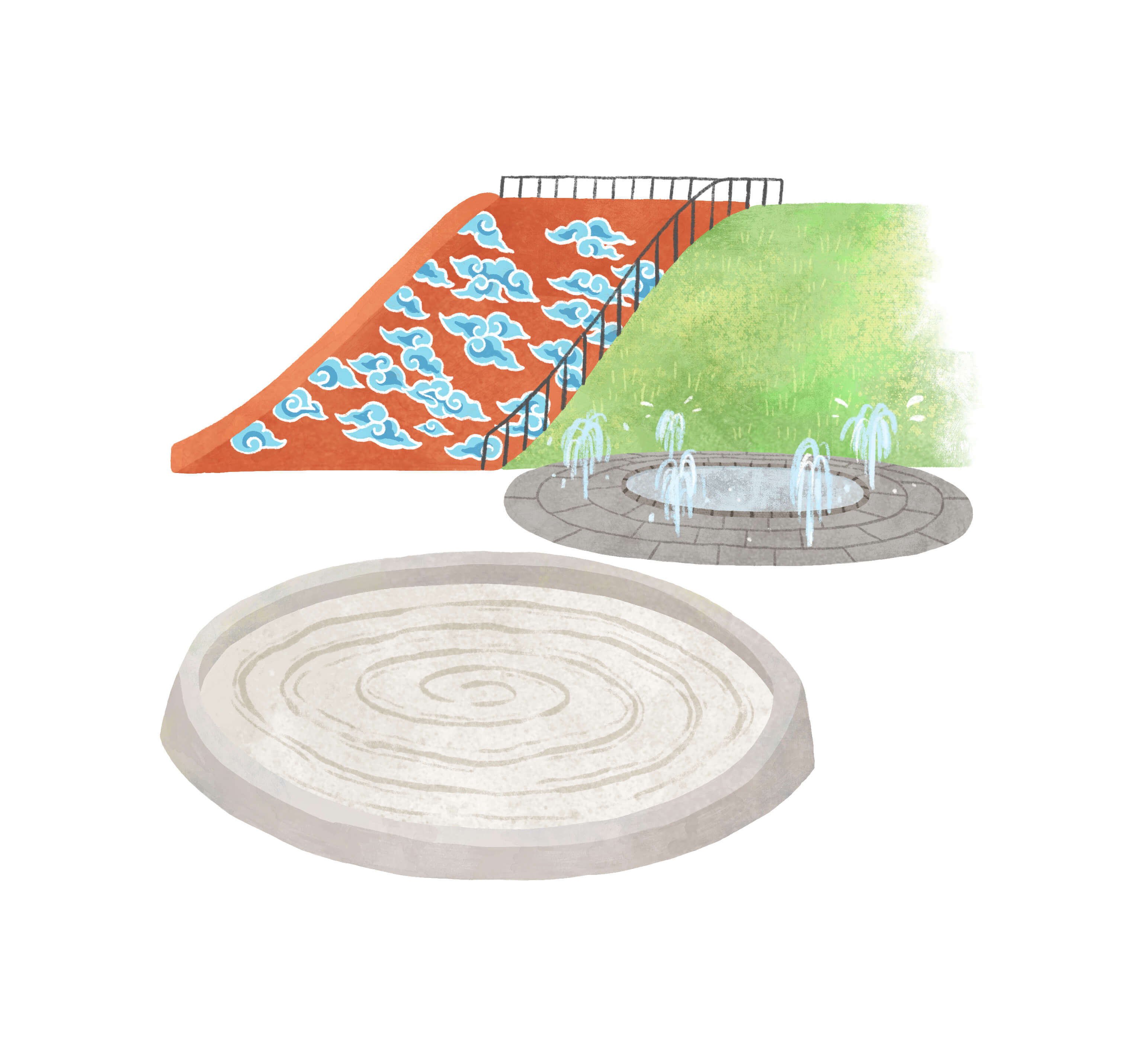 第二寶「飛白泉」每五分鐘噴發、持續約10分鐘,是夏天最受歡迎的戶外景點,若搭配至善湖水舞,戲水與景觀一次滿足。第三寶是「巨雲紋溜滑梯」,現場看非常壯觀,寬廣的滑道、坡度舒適,末端直接銜接沙坑,安全又有儀式感。「第四寶」是由珍珠馬蹄花叢圍出的「波波迷宮」,植栽高度約80公分,小孩能在其中穿梭追逐,從高處俯瞰迷宮,會發現其實是故宮院徽的「饕餮紋」圖騰喔!