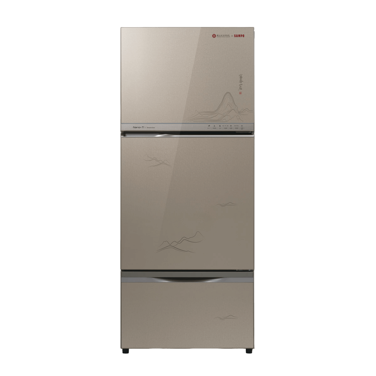 源自院藏品「清 惲壽平 魚藻圖 冊 蝦藻」、「元 黃公望 富春山居圖 卷」,這兩款玻璃變頻三門冰箱融合山水之靜與蝦藻之動,傳遞將自然藝術元素融入家居電器的思維,讓冰箱的外觀多了一份「藝術入家、福氣入門」的美好寓意。