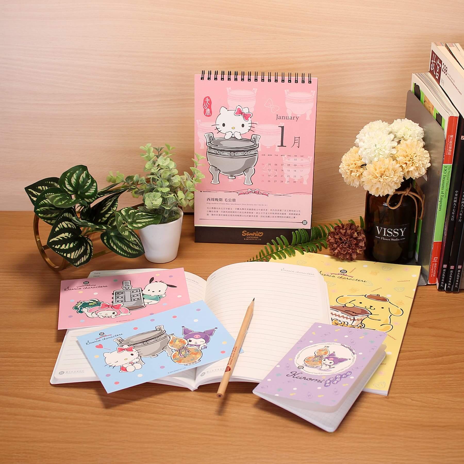 為故宮文創與三麗鷗合作的夢幻聯名系列之一,融合國寶文物美學與當代流行文化,打造出既實用又具收藏價值的紀念商品。桌曆為每個月精選一件故宮國寶文物,搭配人氣三麗鷗明星如Hello Kitty、酷洛米、美樂蒂等,融合故宮珍藏文物與可愛風格,生動呈現互動場景。明信片與筆記本延續相同主題,以兼具文化意涵與萌趣元素陪伴使用者。