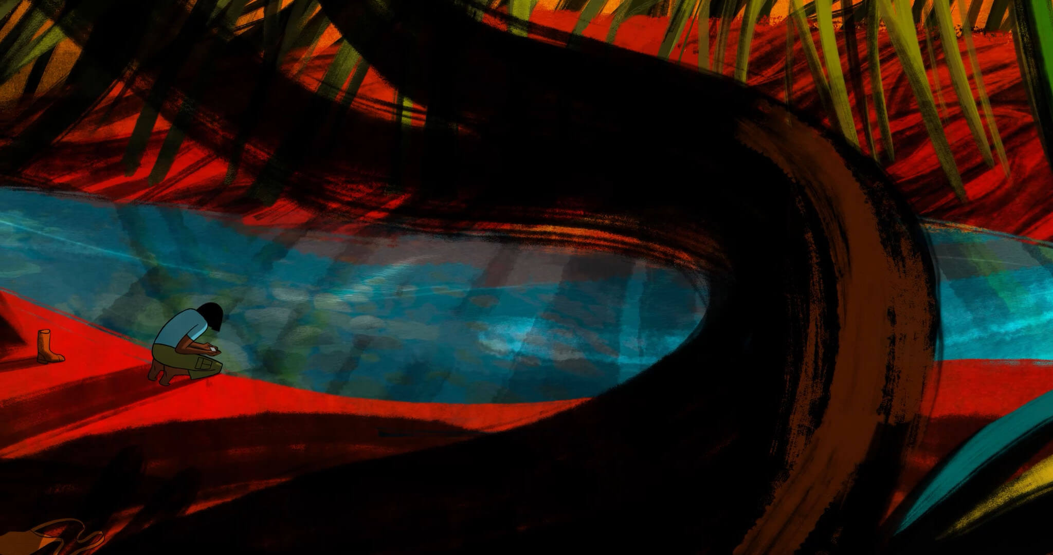 電影開頭第一幕,即明晰地勾勒出故事場景,女性的嗓音訴說著她的夢境:在傾盆大雨的熱帶叢林裡,一個男子倉皇跑過,他身後揚起槍鳴,灰色人影逃竄,最後不支倒地陷入那窪泥淖,一隊身著軍服的人快步行經;而男子倒下的那地,長出了一株巨大、蓊鬱的榕(Mulemba),那枝葉散成蜿蜒河谷中的叢林。