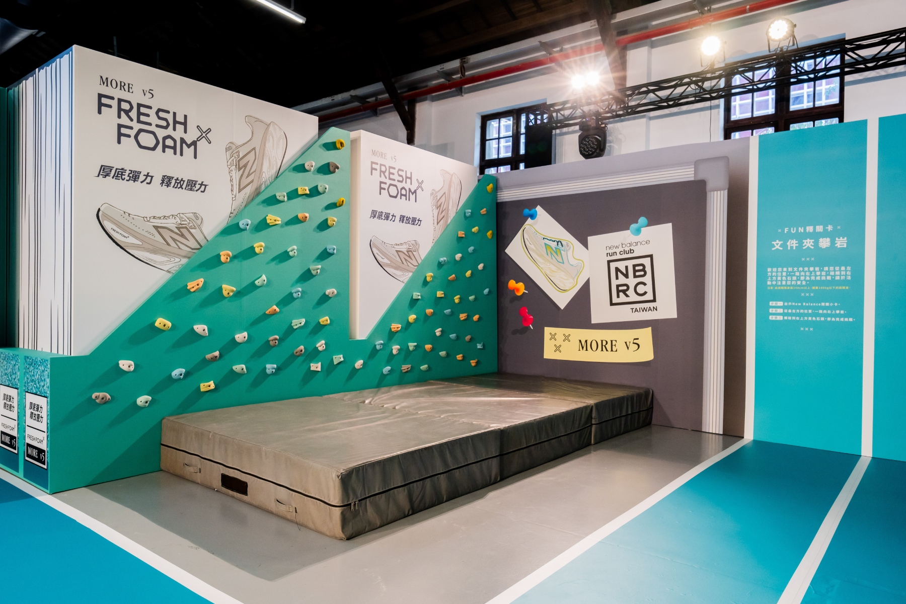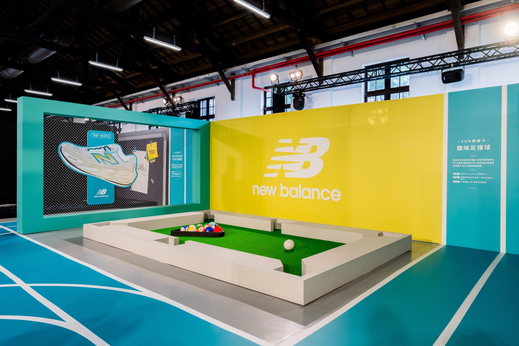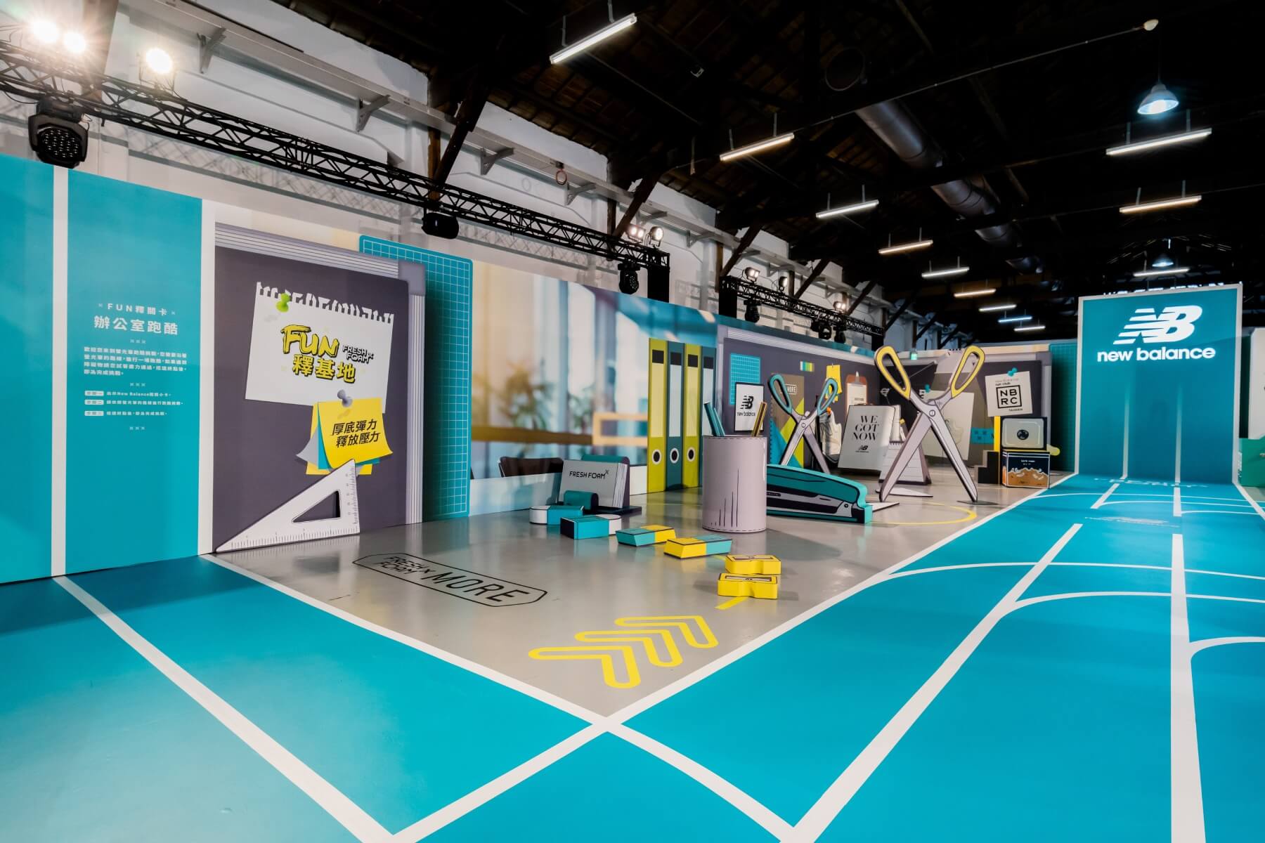 《New Balance FUN釋基地》主場館設置於台北松山文創園區五號倉庫,館內規畫 3 大情境區,分別為釋壓親子運動區、釋壓辦公室運動區與釋壓拍照區,不僅將遊戲元素巨型化,打造親子友善的互動關卡,更特別為上班族打造專屬紓壓空間,讓朝九晚五的職場人士們更能身歷其境地趣味解壓。親子運動區包含將撞球放大成足球大小的「趣味足撞球」、透過巨大彈弓體驗射擊的「彈力健將」與擁有大型氣球標靶的「活力釋射」三個關卡;而辦公運動區則是將辦公室常見的文具元素放大,如「文件夾攀岩」將巨型文件夾變身攀岩牆、「辦公室跑酷」則是在巨型螢光筆繪製的路線上,跨越各式障礙物模擬跑酷體驗,抑或是「More Book Fun 大筆電」在巨大鍵盤上,用腳步敲打出平時不敢說出口的心聲。參與者皆能在主場館內換上最新推出的 Fresh Foam X More v5,透過親自上腳感受鞋款緩震的科技。