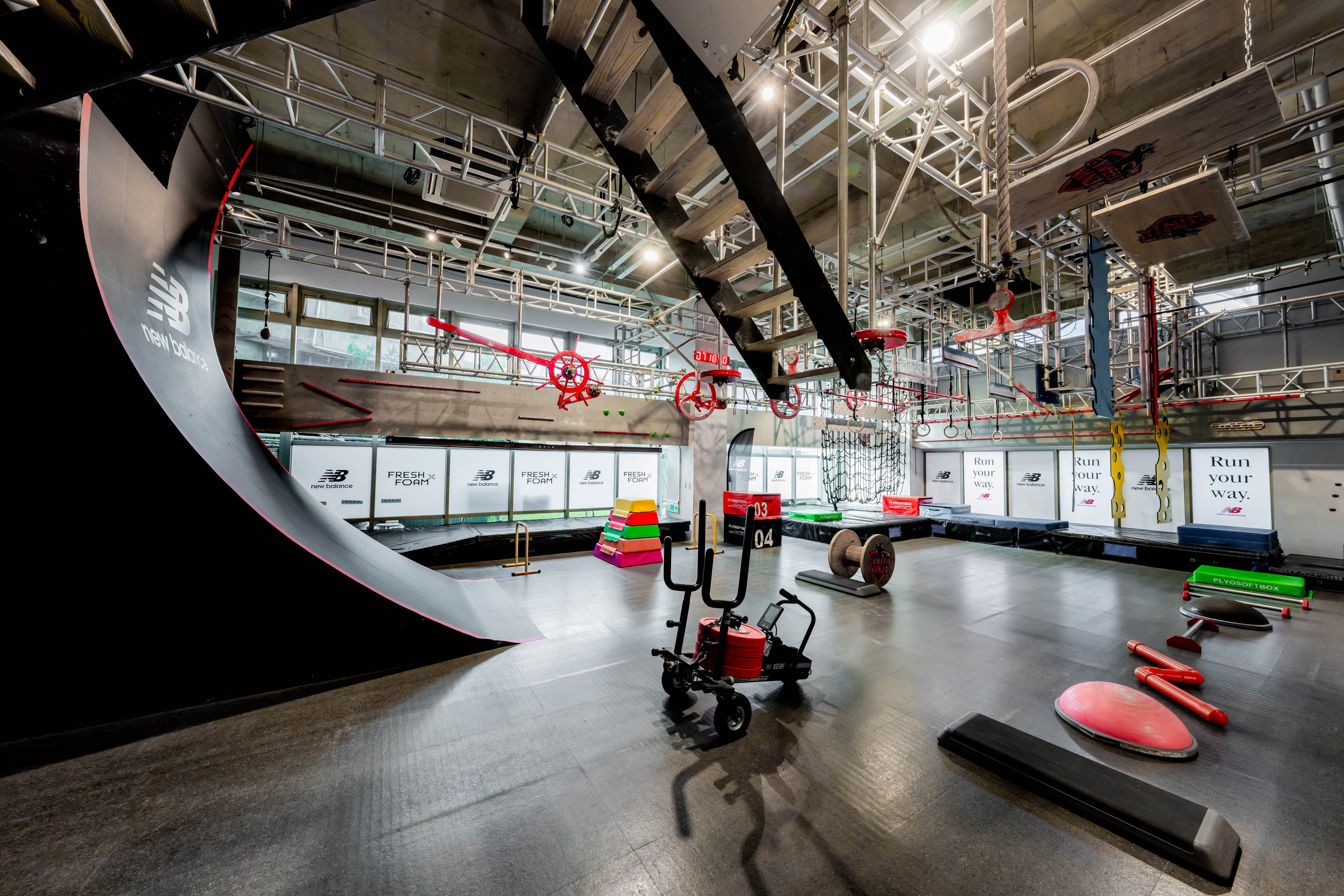 第二大場館《New Balance FUN釋基地》則是與 GYMFIT NINJA 忍者館合作,專為想要挑戰進階關卡的運動好手設計,媲美極限體能王再升級,利用 Fresh Foam X 中底科技的緩震、彈性等特色,結合創新體能關卡,設計一連串的挑戰,穿上 More v5 過關斬將,迎接無限可能!