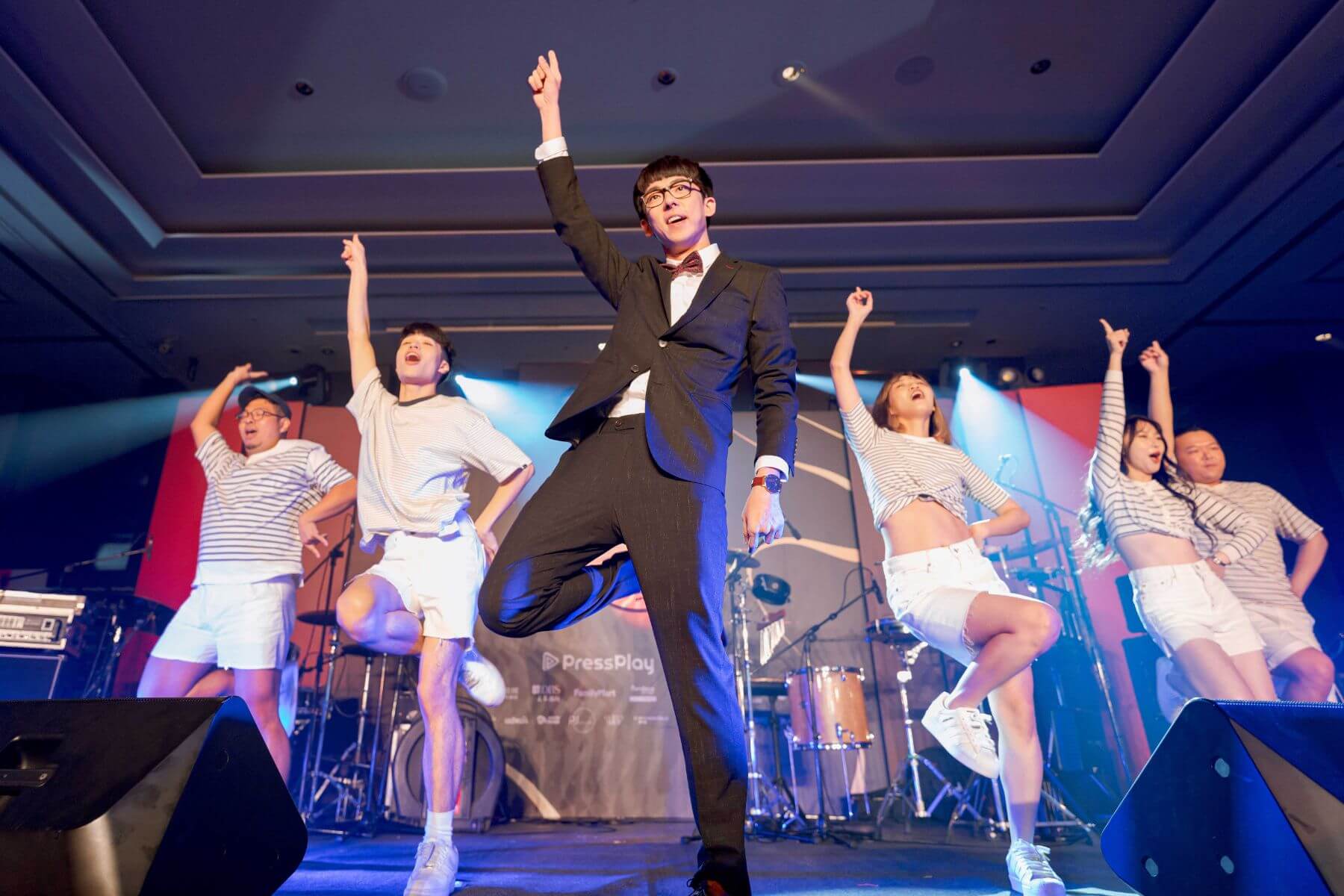 阿滴於台灣新媒體影音創作者協會尾牙表演。(圖/和氣資本、台灣新媒體影音創作者協會)