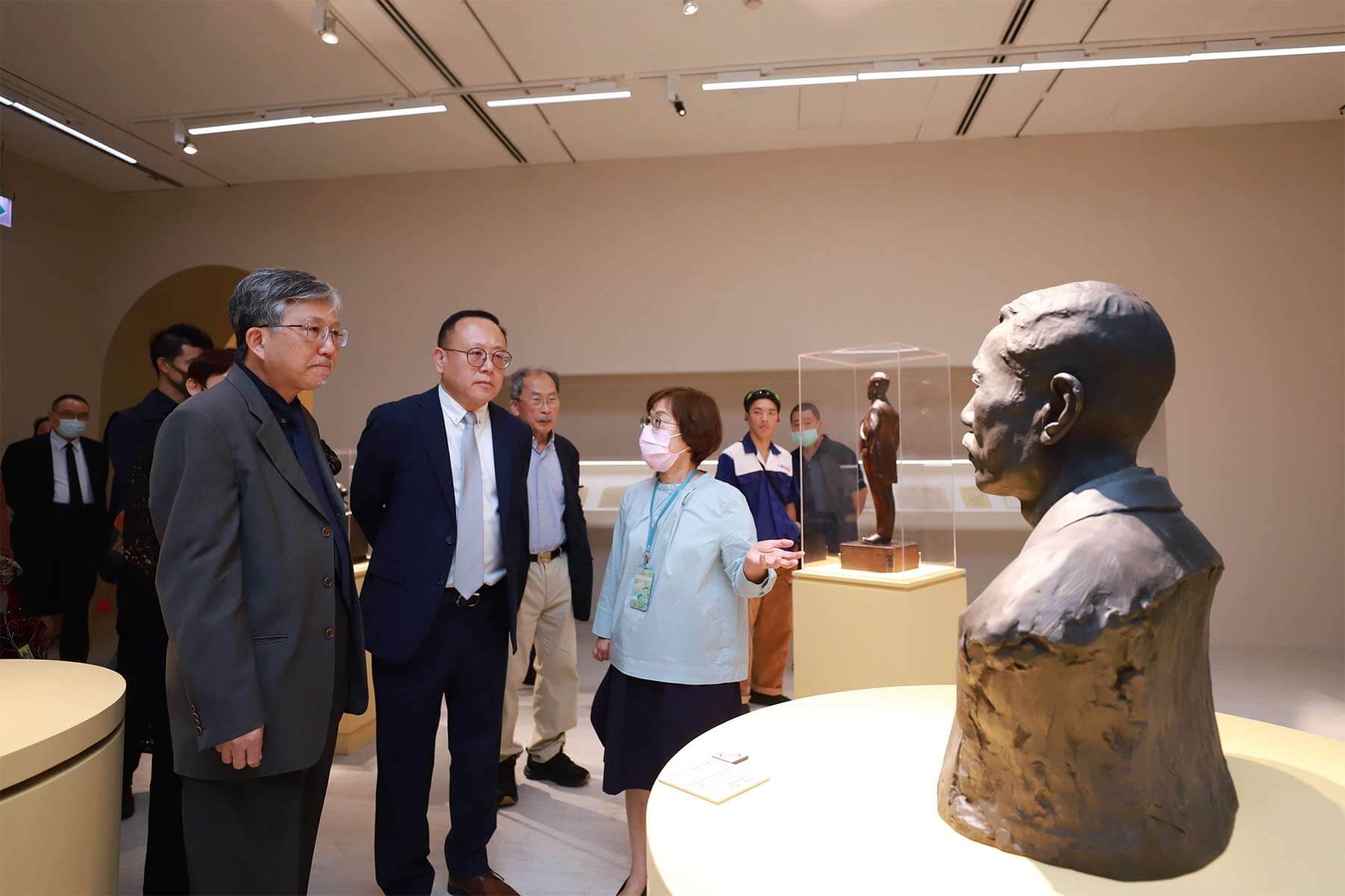策展人薛燕玲(右一)為文化部長史哲(左二)介紹黃土水作品,國美館長廖仁義於一旁共同聆聽(左一)。