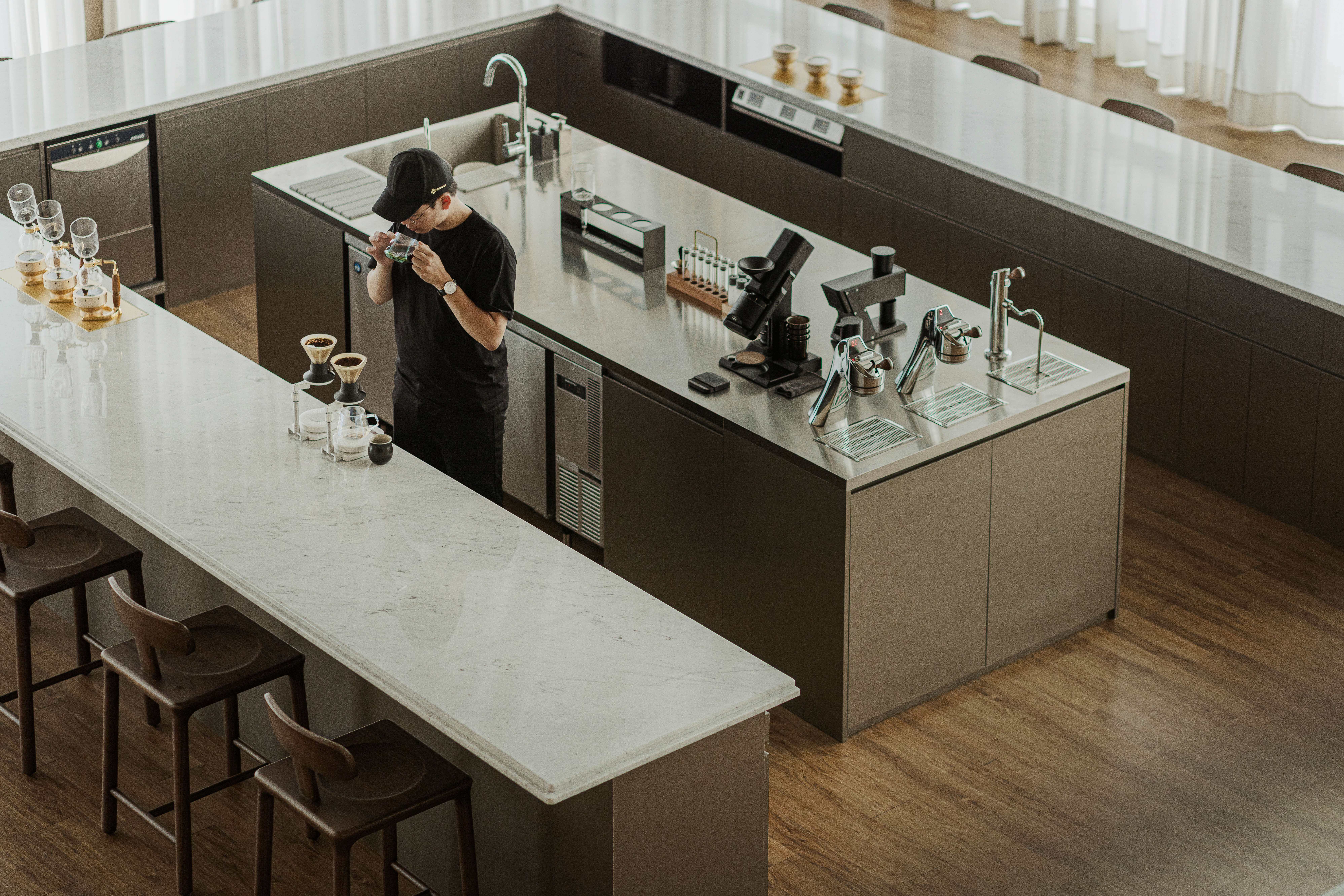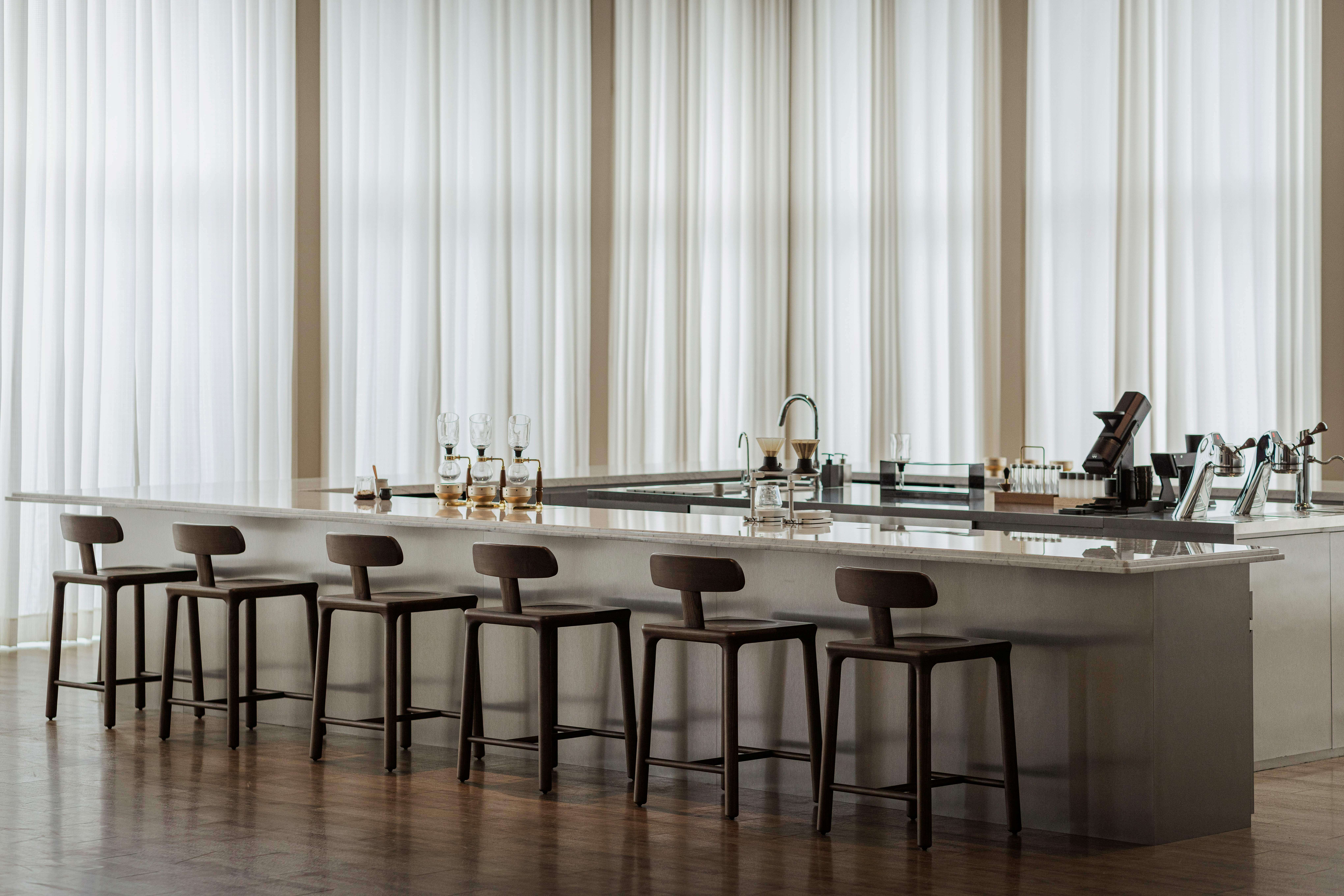 空間裡同樣耀眼的長高吧檯,是專為深入風味探索而特別設計。由於研究咖啡風味時常需要杯測品評嗅聞,高吧檯的高度設計更便於眾人走動、品聞的姿態,同時也因為高度貼近口鼻,在細緻比較時能更加專注,對於咖啡研學不僅更精準且更高效率,創辦人Joseph提到,「這樣的設計,全是為了讓探索咖啡風味更加聚焦。」