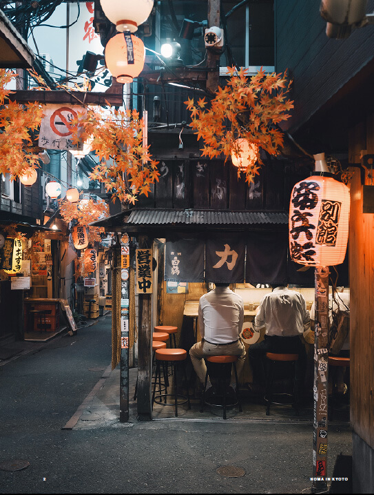 在京都迷宮般的街道巷弄中,日式居酒屋文化在下町市中心鮮活展現出古今共存,或許也反映人們對過往單純年代的嚮往。對於充滿好奇心、有品味的旅客而言,京都除了高雅的廟宇、枯山水和茶屋外,還有非常多值得挖掘的地方。京都豐富而緊密的鄰里文化,只有耐心、懂門路的人才能在悠閒漫步中發現,這是旅遊書上找不到的,全靠漫遊的旅人自己探索。