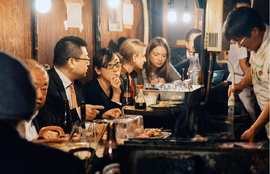 在居酒屋,客人坐在吧檯邊,或坐在榻榻米(疊蓆)上就著矮桌,以生啤酒和鹽水毛豆展開當晚的美味之旅。優質居酒屋幾乎都會端出擺盤出色的生魚片,用的都是當天最新鮮的海鮮,接著是推陳出新的下酒菜:整尾都能吃的柳葉魚(肚子塞滿魚卵)、小巧精緻的槍烏賊裹黃味噌,當然也有廣受歡迎的日式炸雞(唐揚雞)或串燒。不同於西班牙木籤下酒菜小館或義大利小餐酒館的單人份餐點,居酒屋鼓勵分享共食,能自然而然加深友誼。