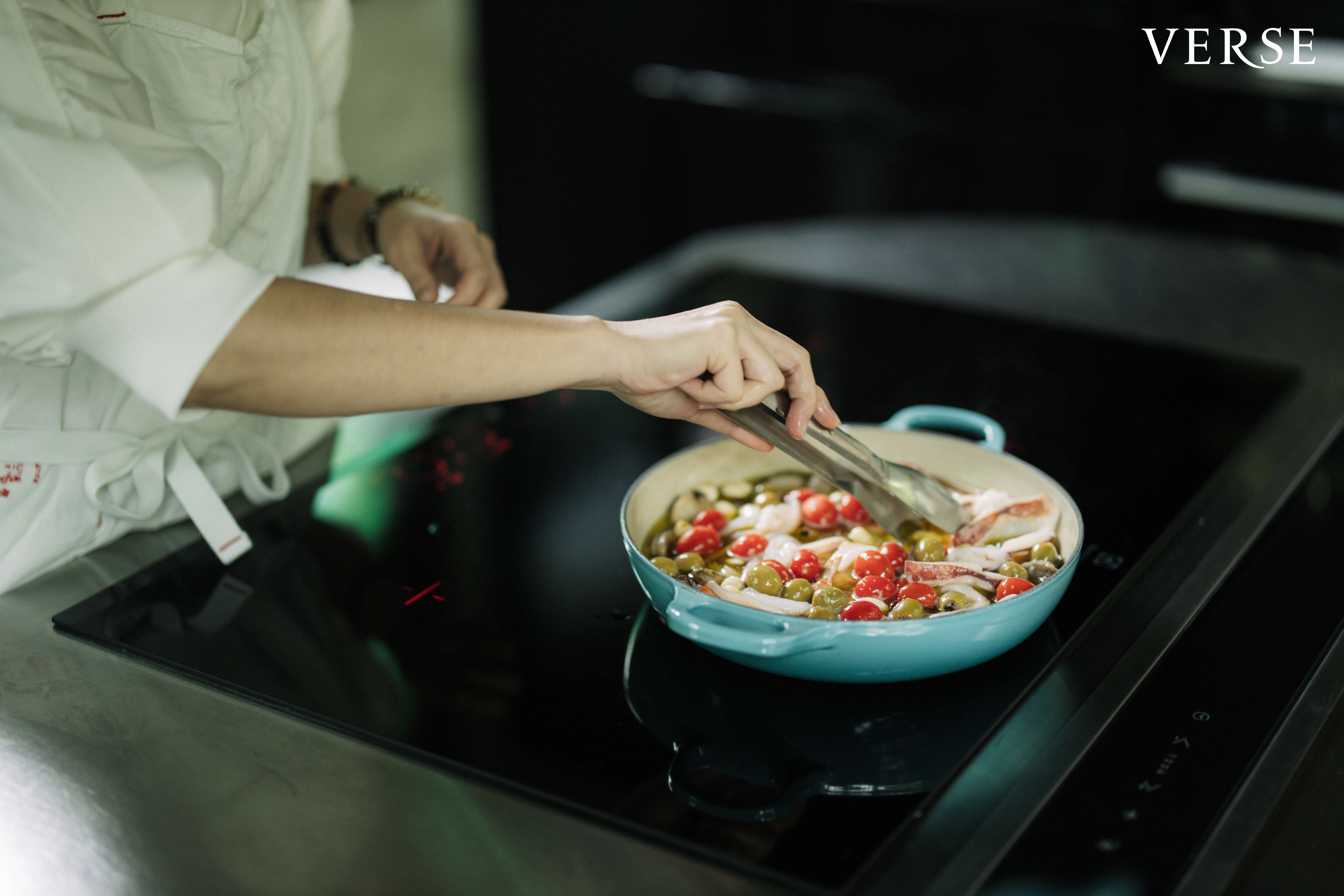 油封蒜頭海鮮香噴噴地上桌,裡面有新鮮的蝦子和花枝,加入金黃色的橄欖油和蒜頭,還有紅色的小番茄、綠色的橄欖相襯。Nora 說,這是一道她很常在派對宴客或家庭聚餐上煮的料理,「它看起來很複雜,但做了會發現很簡單。」美食頻道裡的完美廚房乍看遙不可及,但只要願意在生活中發揮創意,也能像 Nora 廚房裡的大理石餐桌,替平凡的生活創造出不平凡的意義,轉眼間就會發現自己已活在最嚮往的空間裡。