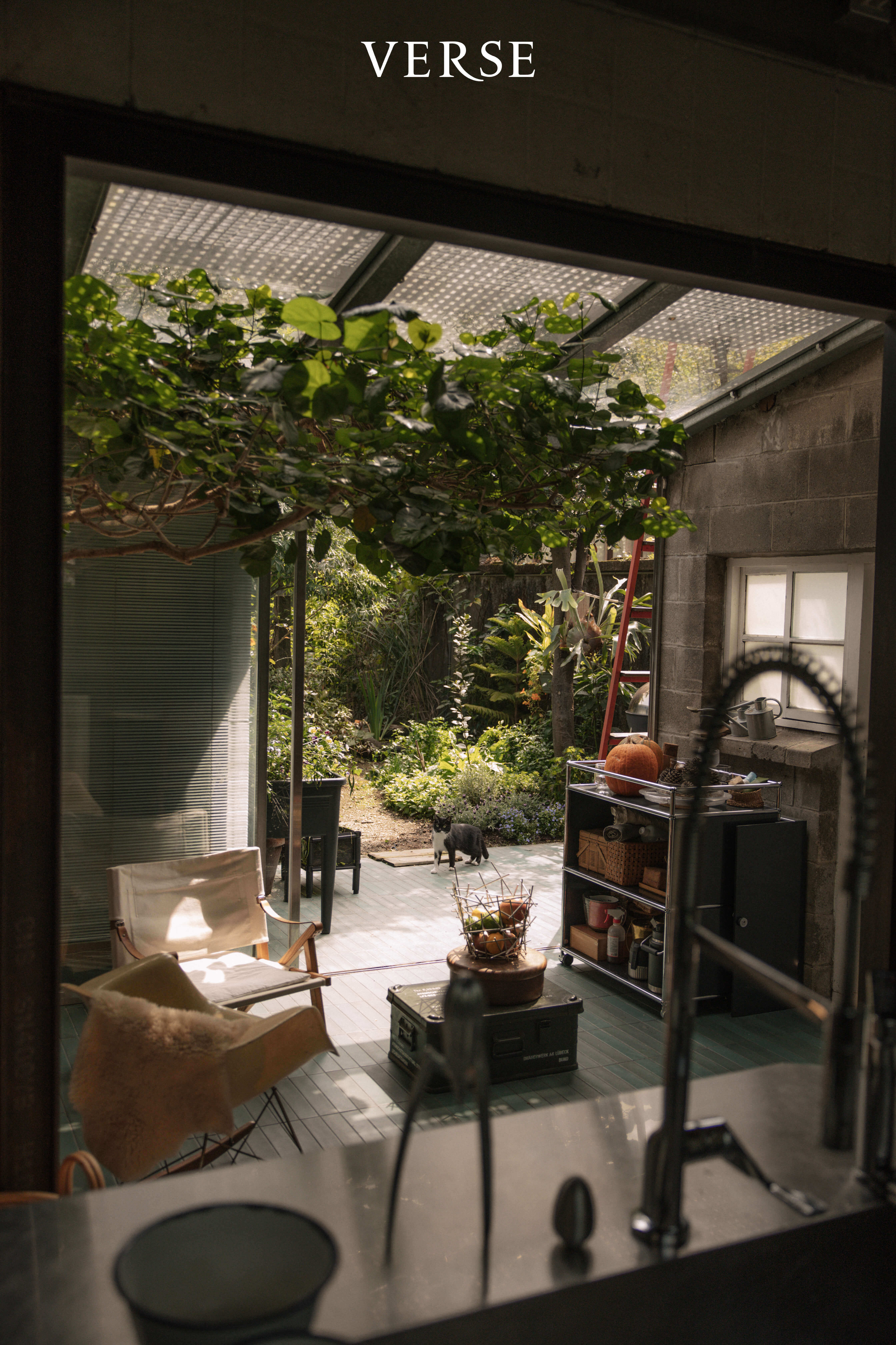 「我可能烹飪節目看太多了!我就是會邊煮邊擦的那種⋯⋯。」爐上的油封蒜頭海鮮正在加熱時,順手就在擦起桌面的 Nora 笑稱,她做菜的流程深受烹飪節目影響,十分井然有序,說完並起身走到中島前方的小花園,挑選適合下鍋的香草。Nora 的廚房由挑高的木作老屋改造而成,陽光可以直接照進半開放的空間裡,還有一座不時會長出各種驚喜的香草花園。這片儼然在生活頻道才會出現的廚房景緻,都是由身為室內設計師的 Nora 親手打造。