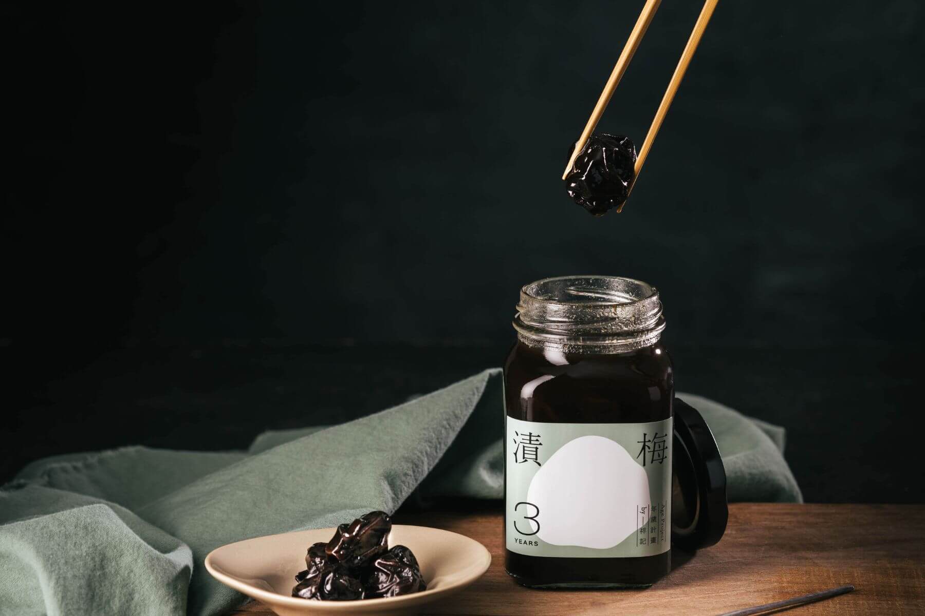 傳承三代的漬梅品牌「祥記」,本即在鄰近阿里山的嘉義中埔鄉自營東營梅園,創意料理中的「十年陳年梅酒」便是選用台灣青梅陳釀:酒湯呈現琥珀色澤、風味圓潤香氣濃郁,沒了梅子酸澀的口感,多了溫潤的滋味。展場中,也另以年歲計畫呈現漬梅工藝,如從三年漬梅、五年漬梅與七年漬梅等,標記出不同時長的歲月,所賦予漬梅的不同特色:酸甜度、口感與果肉質地上,三種年份皆有完全不同的表現。
