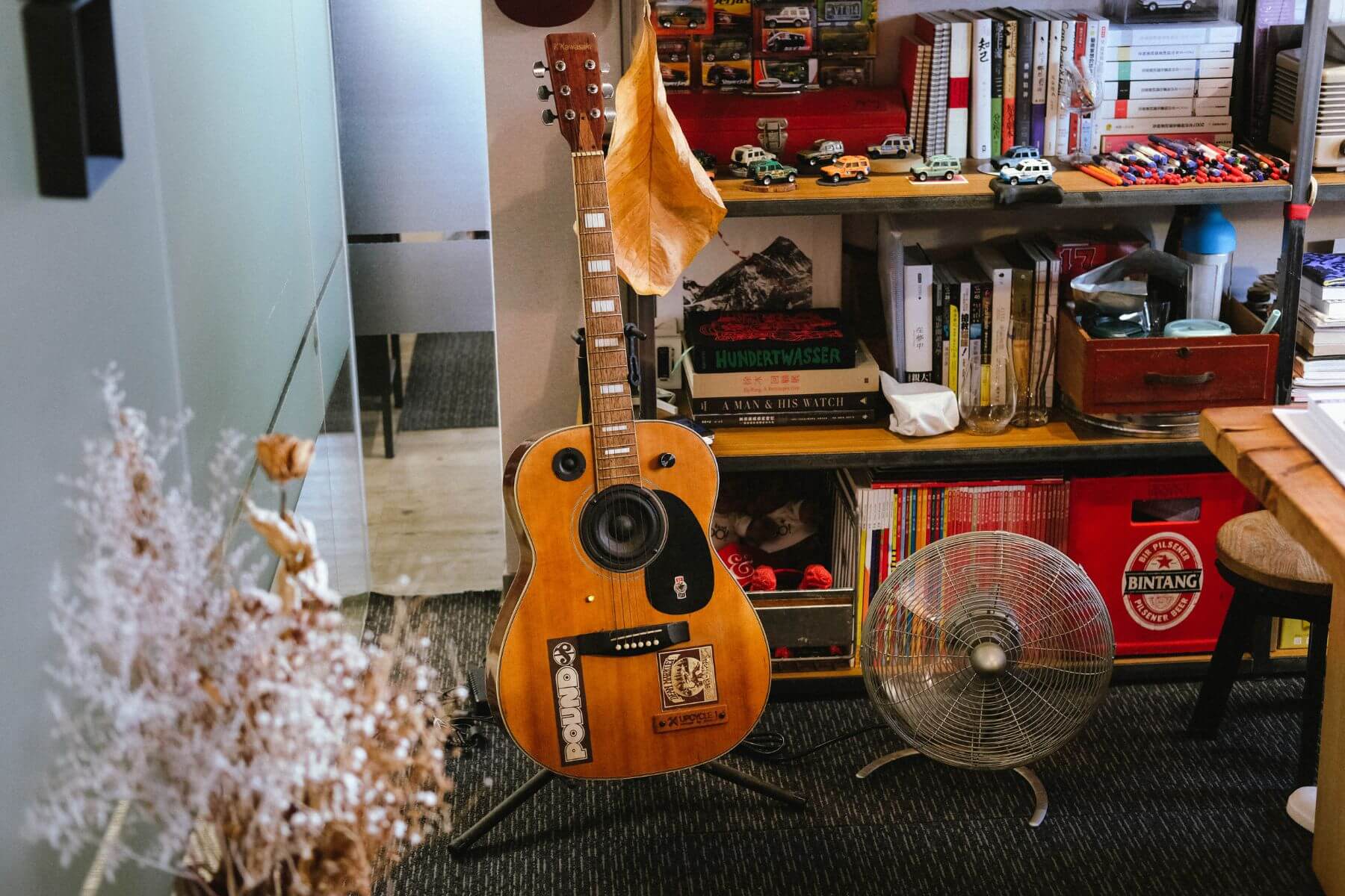 這是我高中的第一把吉他,因為基板變形了不再能彈。後來有個朋友幫我把這把吉他改造成喇叭——他用單體喇叭,上面再加一個高音喇叭;吉他的木箱則有共振音場的共鳴,出來的音樂會有那種木質吉他的舒服感覺。(說完,用吉他音響播起了以莉・高露。)