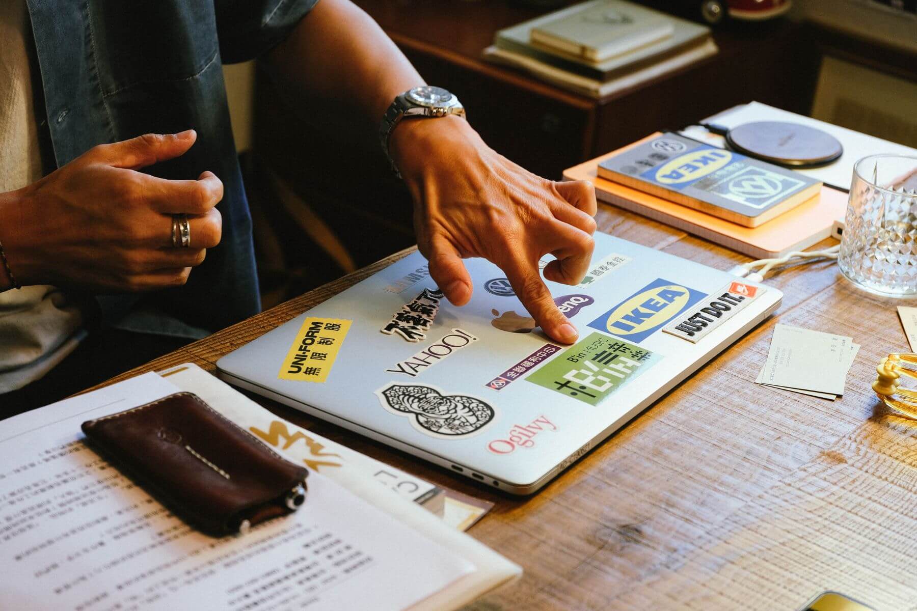 筆電上的貼紙都是我的客戶們,有做過的和目前還在做的客戶,還有一些沒貼紙我就不貼了——像現在我們在做Uber Eats,可是我還沒有拿到Uber Eats的貼紙。如果拿這台筆電跟客戶開會,客戶都會很開心,覺得「你心中有我們」。