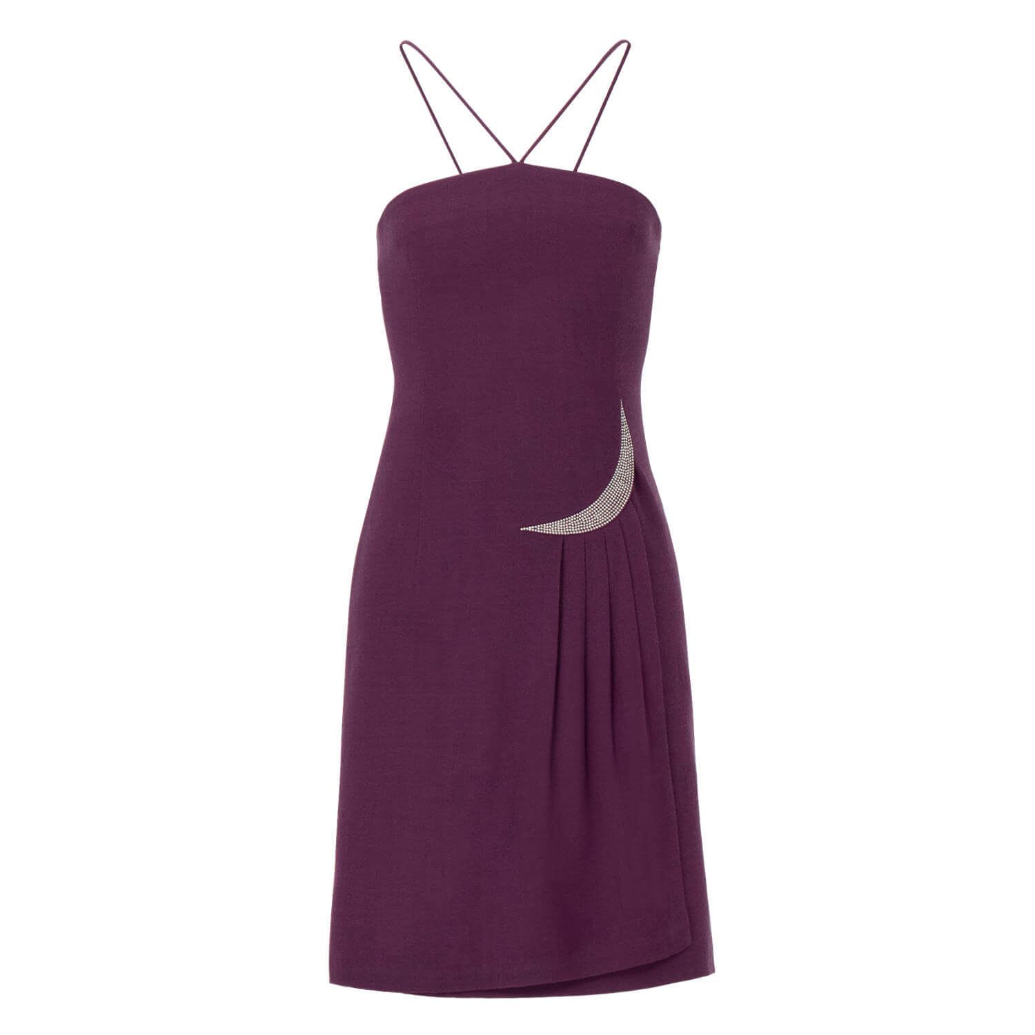 邵雨薇則以優雅率性的混搭造型現身,演繹米蘭伸展台上「高低混搭」與層次穿搭趨勢。上身選擇藍色綁帶層飾背心,搭配紫色刺繡短裙,透過柔和色彩與垂墜線條營造女性化輪廓。裙身以靈感源自月亮意象的金屬線刺繡作為視覺焦點,低調閃耀於布面之上,並延伸至裙襬層次設計,為整體造型增添細膩而鮮明的辨識度。
