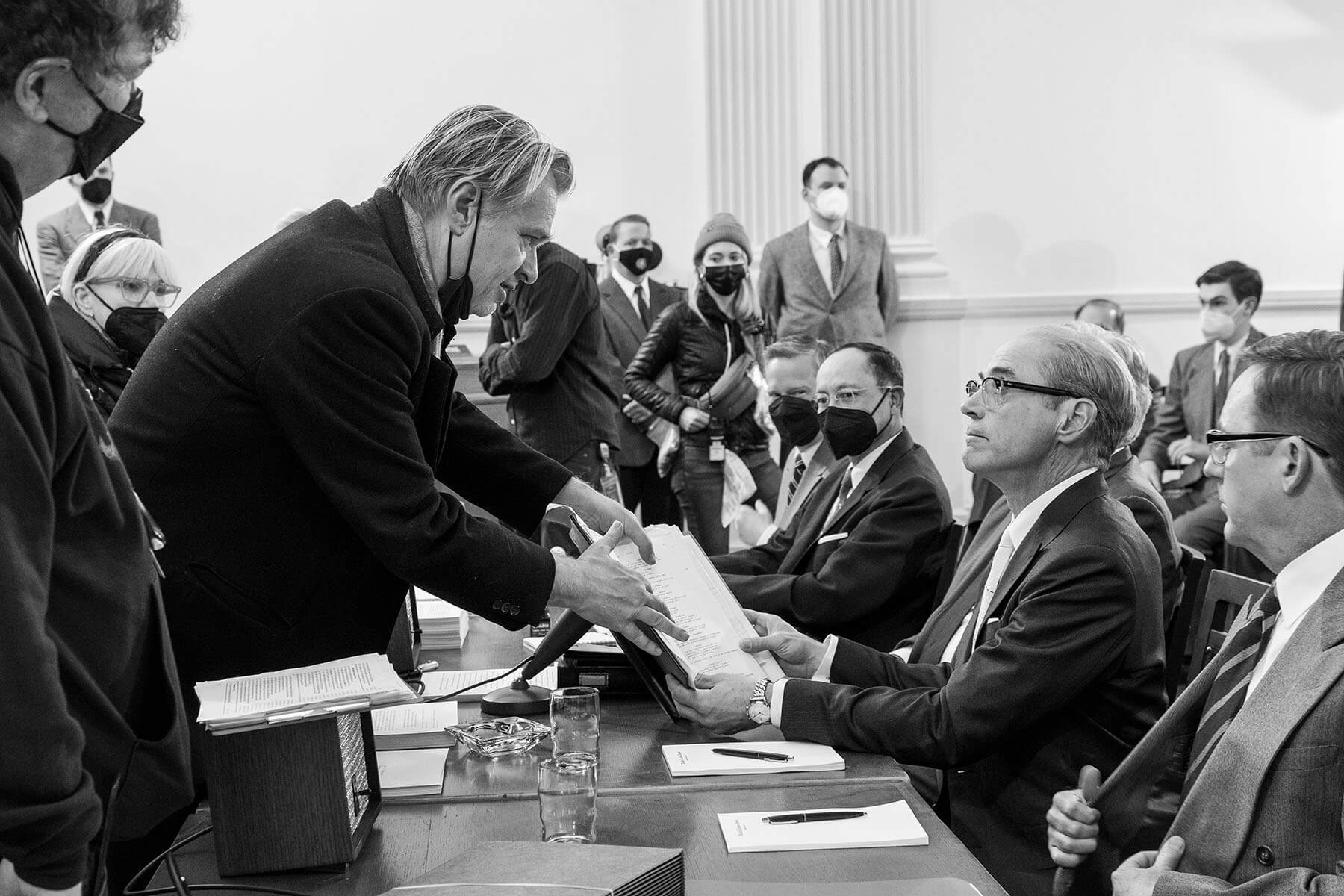彩色畫面為奧本海默的觀點,黑白畫面則是路易斯‧史特勞斯(Lewis Strauss,前美國原子發展委員會主席)的視角,諾蘭審慎提供兩種對立的歷史觀點,在話留三分的內斂敘事中,觀眾漸漸知曉兩人之間的恩怨從何而來,甚至以彼得‧謝弗(Peter Levin Shaffer)的舞台劇《阿瑪迪斯》中莫扎特(Wolfgang Amadeus Mozart)和安東尼奧‧薩里耶利(Antonio Salieri)的關係作比喻:一個傑出、受困的心靈,以及一個氣度狹小、握有權勢的男人,既仰慕也折磨他。