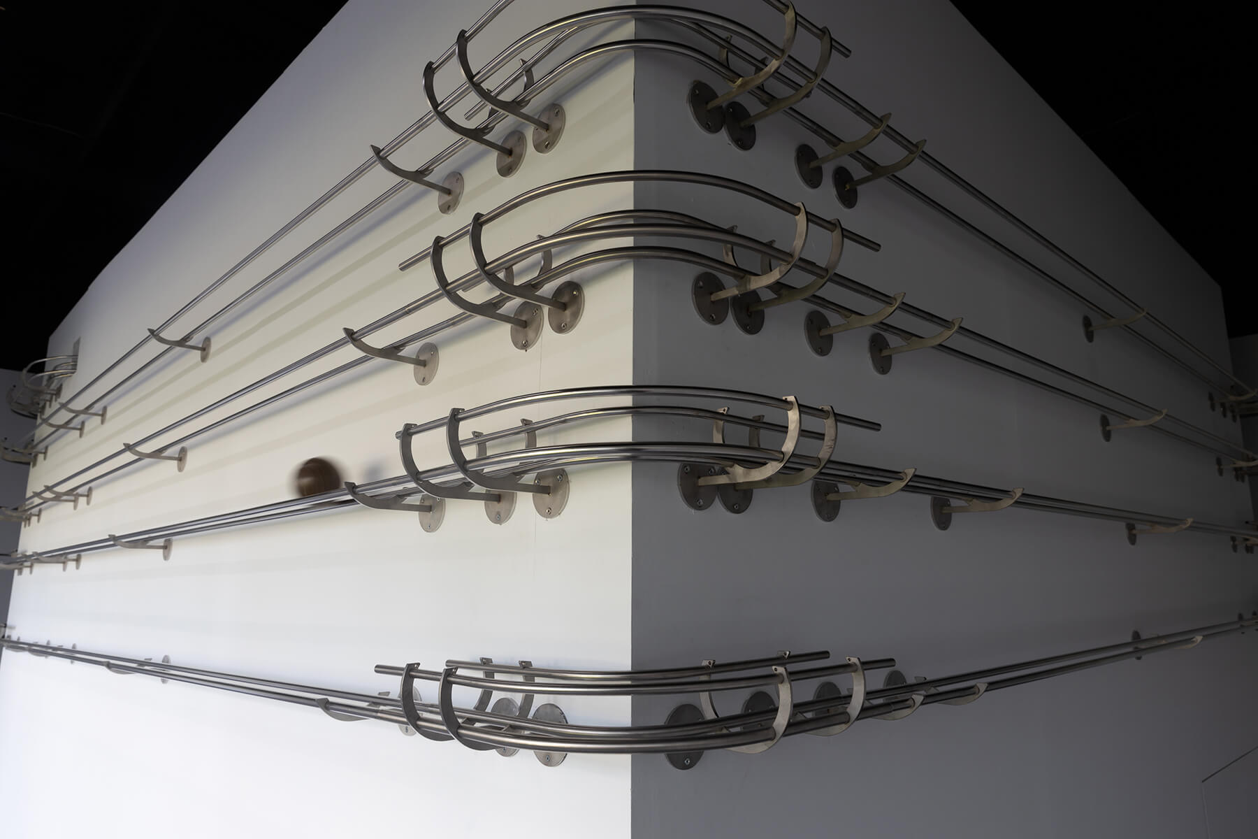 「每次回來我都會去海邊。」2017年以《花蓮白燈塔》獲得臺北美術獎首獎的王煜松,將他在花蓮溪口嶺頂考古遺址感受到的時光帶來現場。「那些東西默默存在,我們沒有去開挖發掘它也還是在那。」當作品《花園—花蓮》的圓球在搭建軌道上滑動時,就如同考古遺址的文化層般,地心引力是物質存在唯一的證明。