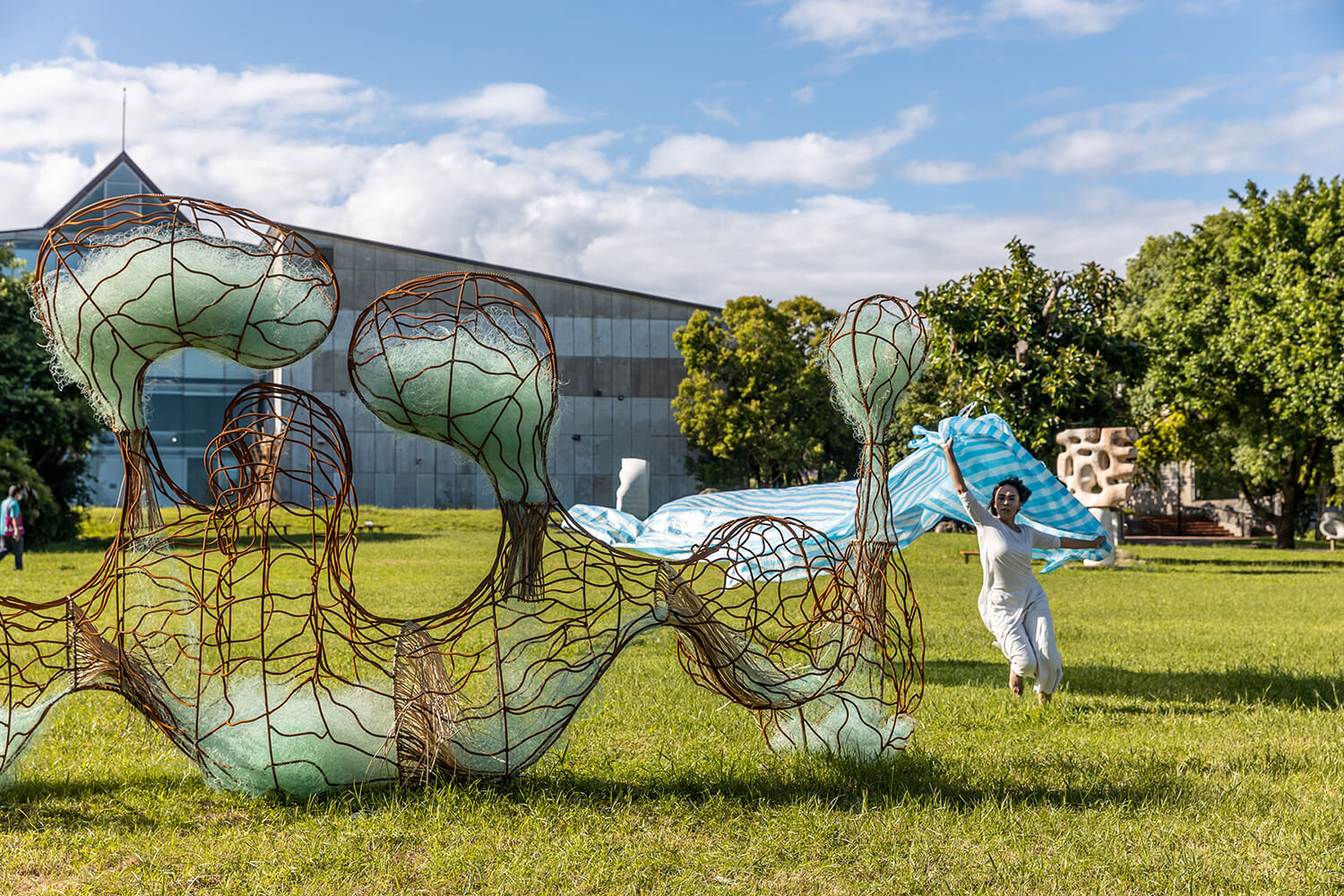 「部落的人被遷離山上後,能選的工作就只有礦工或林班。」風景決定命運,命運決定時代。擅長織材運用的林介文,成長部落上方就是一個礦場。部落生活與礦業息息相關,她選擇用溫柔的織布包裹住怪手。作品《停工》結合太魯閣族傳統織布、花蓮家戶常見夏天用來遮陽的綠網,以及每逢選舉插滿街道的競選旗幟,因為有時候風景無法選擇。「這些會出現在我們眼前的東西,是我們真的想要的嗎?」
