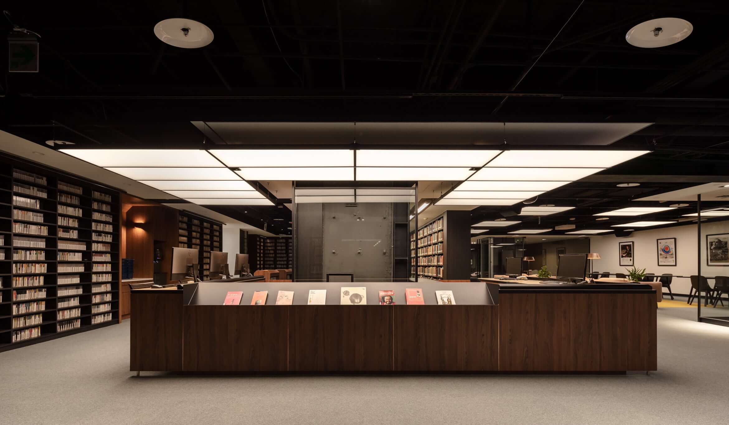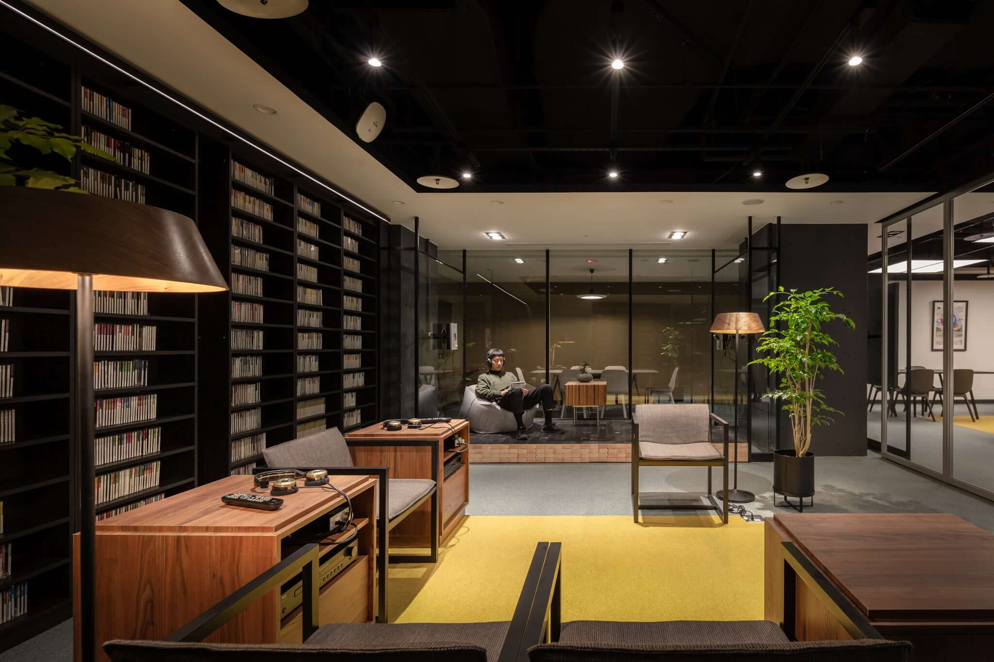 如今,入口的層層階梯化為一條無障礙廊道;大型鐵書櫃由亮黃色地毯載著的綿軟座椅取而代之,成為寬敞的閱覽交流區;唱片型的掛燈在昔日如K書中心般硬邦邦的視聽座位旁暈出溫暖黃光;館內最深處更嵌著重新調整過的特殊典藏室,安放資深樂評及收藏家曹永坤遺贈的黑膠唱片、CD及古董唱機,讓人們能安坐其間,在隨心點播的旋律中陷入沙發與樂音⋯⋯不再只「服務館藏」,表圖以硬體的改造表態:「服務人」更加重要。