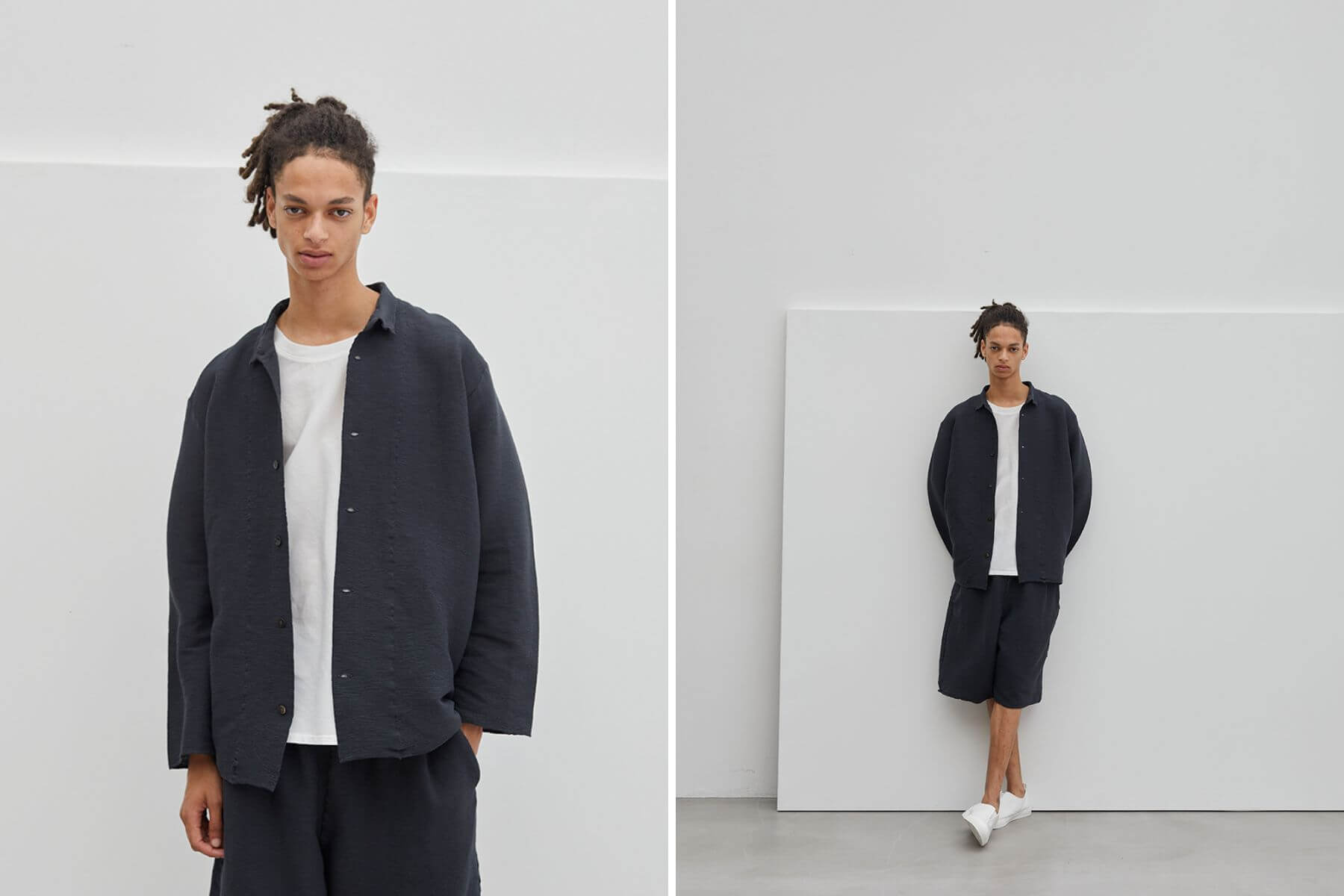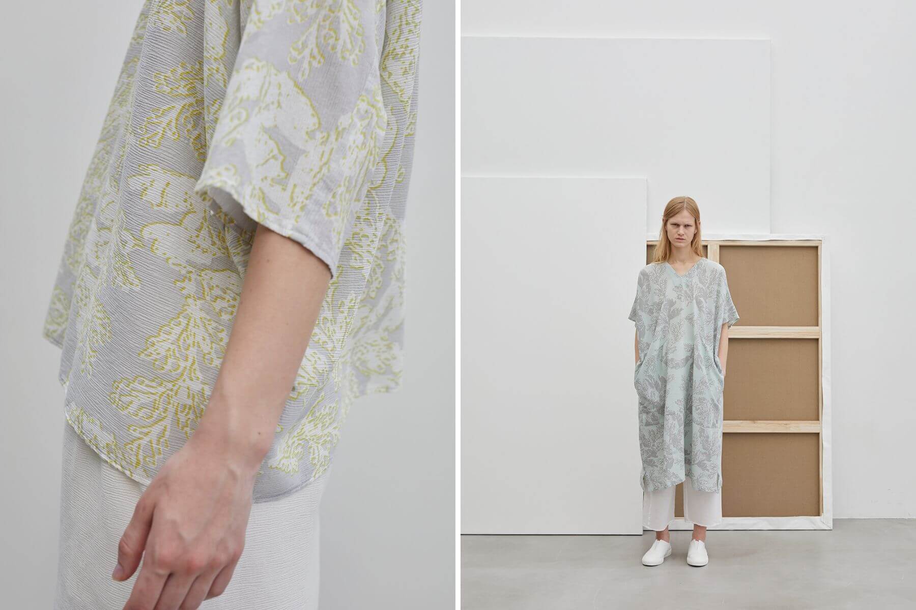 對此,Plantation跳脫框架,將原本直條的高島縮波紋布料採取橫向使用,創造出穿著者移動時會上下彈跳的自然布料「YOORYUU」,其有如舞蹈般的動感與隱約的透光感使其成為了獨特的現代服裝,而純棉的材質與高島縮的涼爽特性,更使該系列成為四季皆可穿著的日常服。