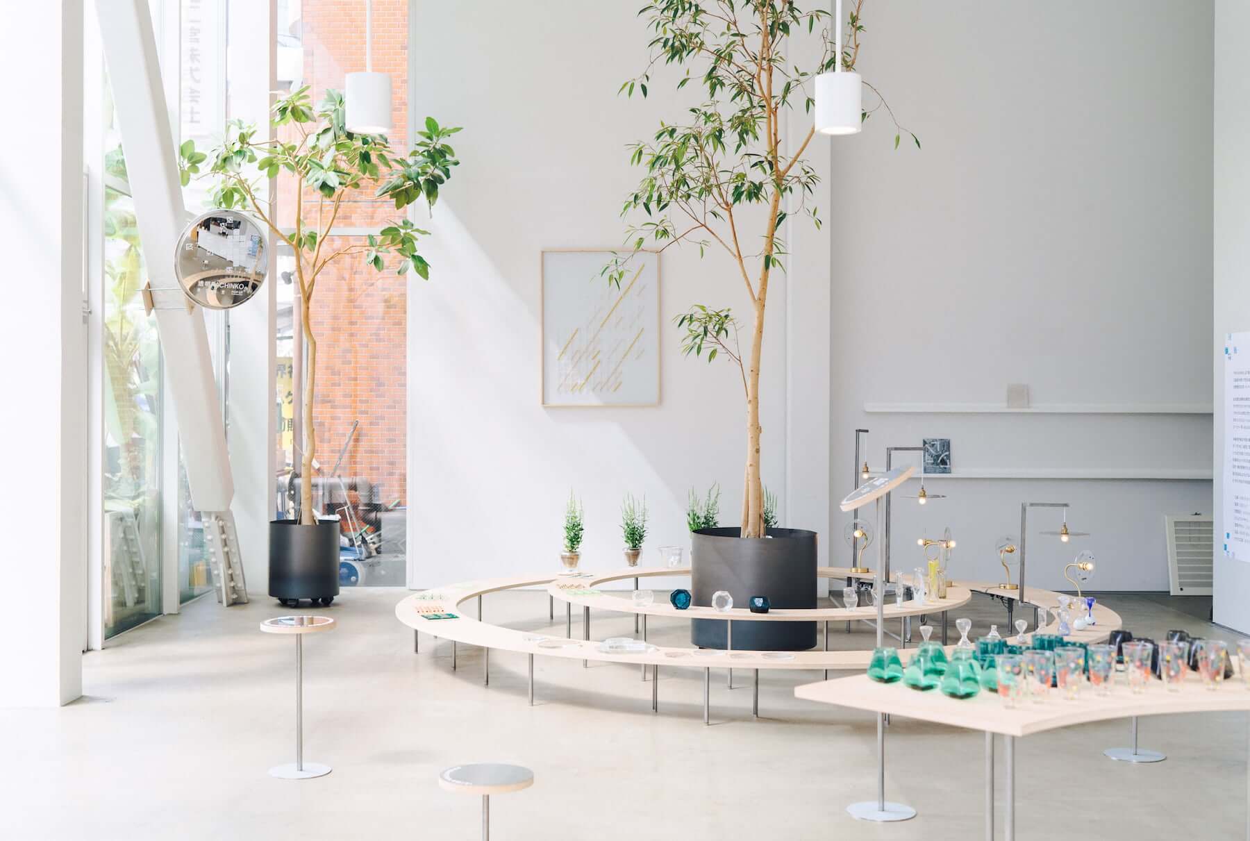 春室在每一檔展覽中,都會為展覽設計專屬飲食或甜點,此次東京春室POP UP選用臺灣在地食材與日本冰淇淋互相交融,將餐飲重新轉化,推出「仙女冰淇淋紅茶」、「青提果凍泡泡」等透明飲食,並以春池手工玻璃杯盛裝,在陽光照射下呈現閃閃發光的視覺享受,藉由透明餐點呼應芝浦之家開放性的建築通透感,也透過餐飲串連台日交流。