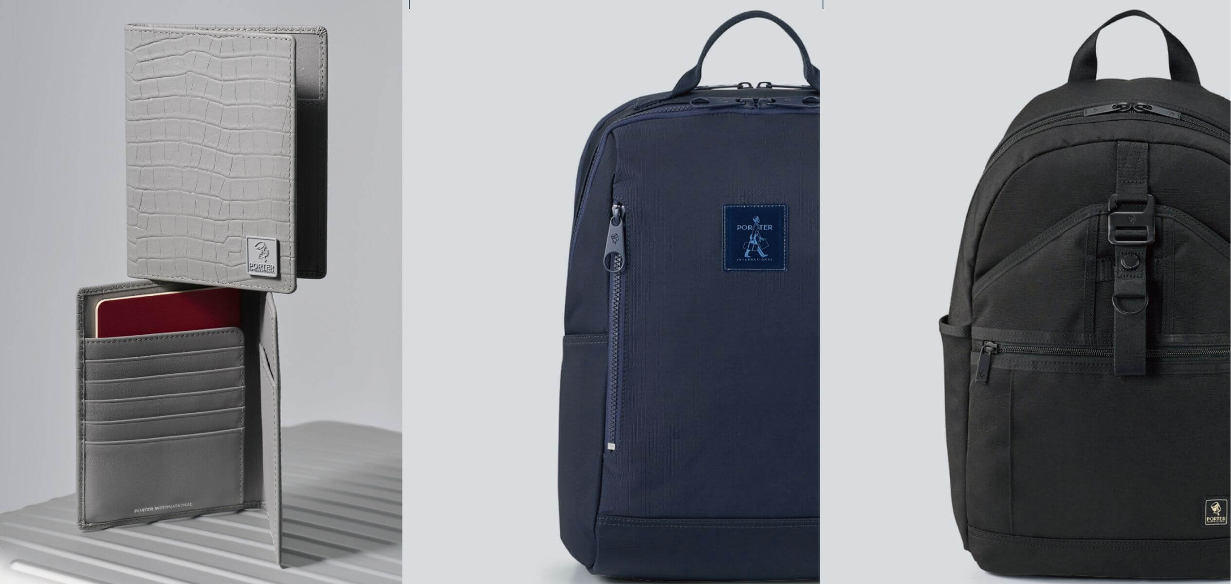(由左至右)NOBLE真皮護照夾、ZEST雙層後背包、ULTRA後背包 by PORTER INTERNATIONAL。