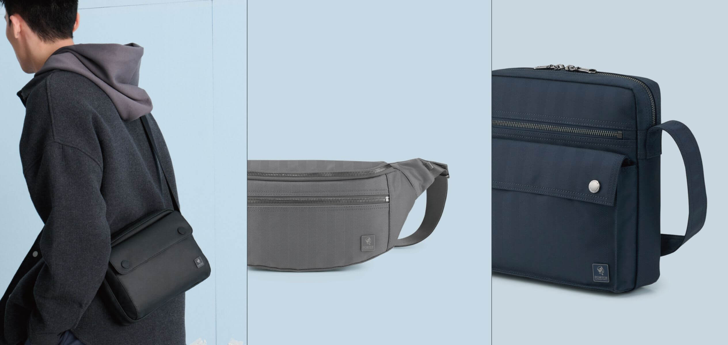 (由左至右)HARDY斜肩包、MELODY腰包、MELODY斜肩包 by PORTER INTERNATIONAL。
