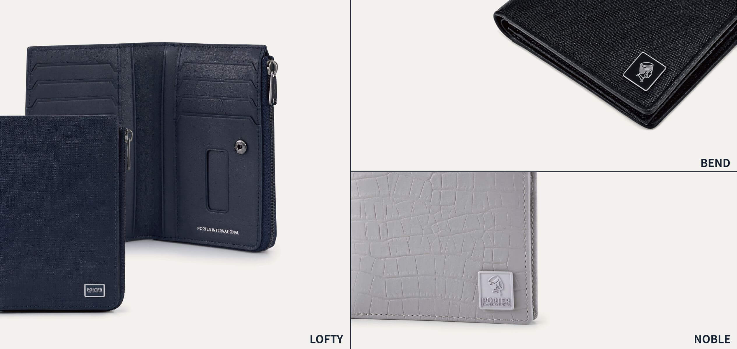 (圖左)LOFTY真皮L型短夾、(右上)BEND真皮雙折零錢短夾、(右下)NOBLE真皮雙折零錢短夾 by PORTER INTERNATIONAL。