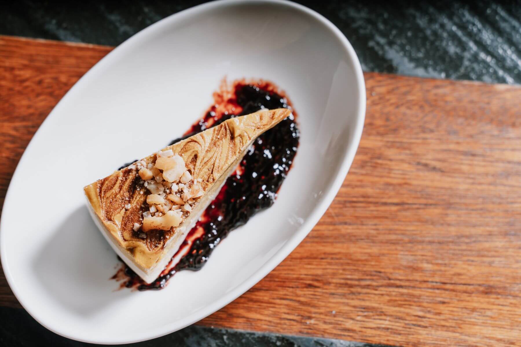 地球平安起士蛋糕,頂層香料、南瓜醬和腰果碎,肉桂和豆蔻夾在中間,椰奶混腰果製成的起士單高主體和布朗尼鋪底,最後點綴手工熬煮莓果。