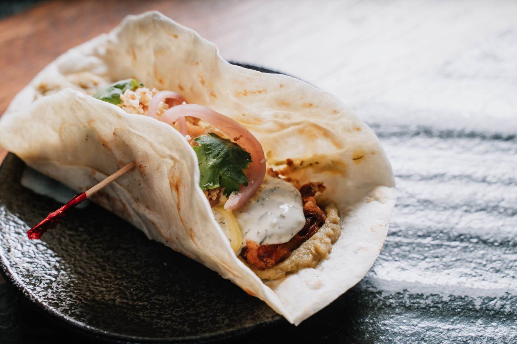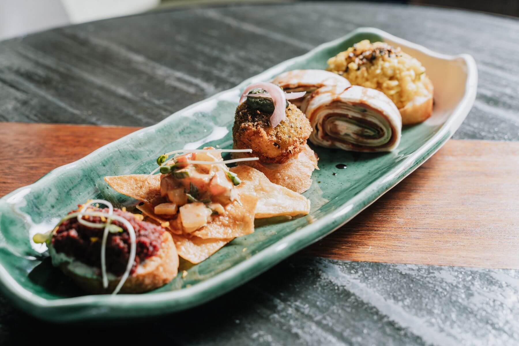 周三夜,也是紅房的「塔帕斯之夜(Tapas Night)」,推出一日限定的「DEJA FOOD」系列,取材常見的小吃,添加小巧思,像是一道「魚塔可」,裡頭的炸魚塊其實是香料醃漬的天貝,裹麵糊油炸而成,口感細緻,不說也不會察覺在吃素。