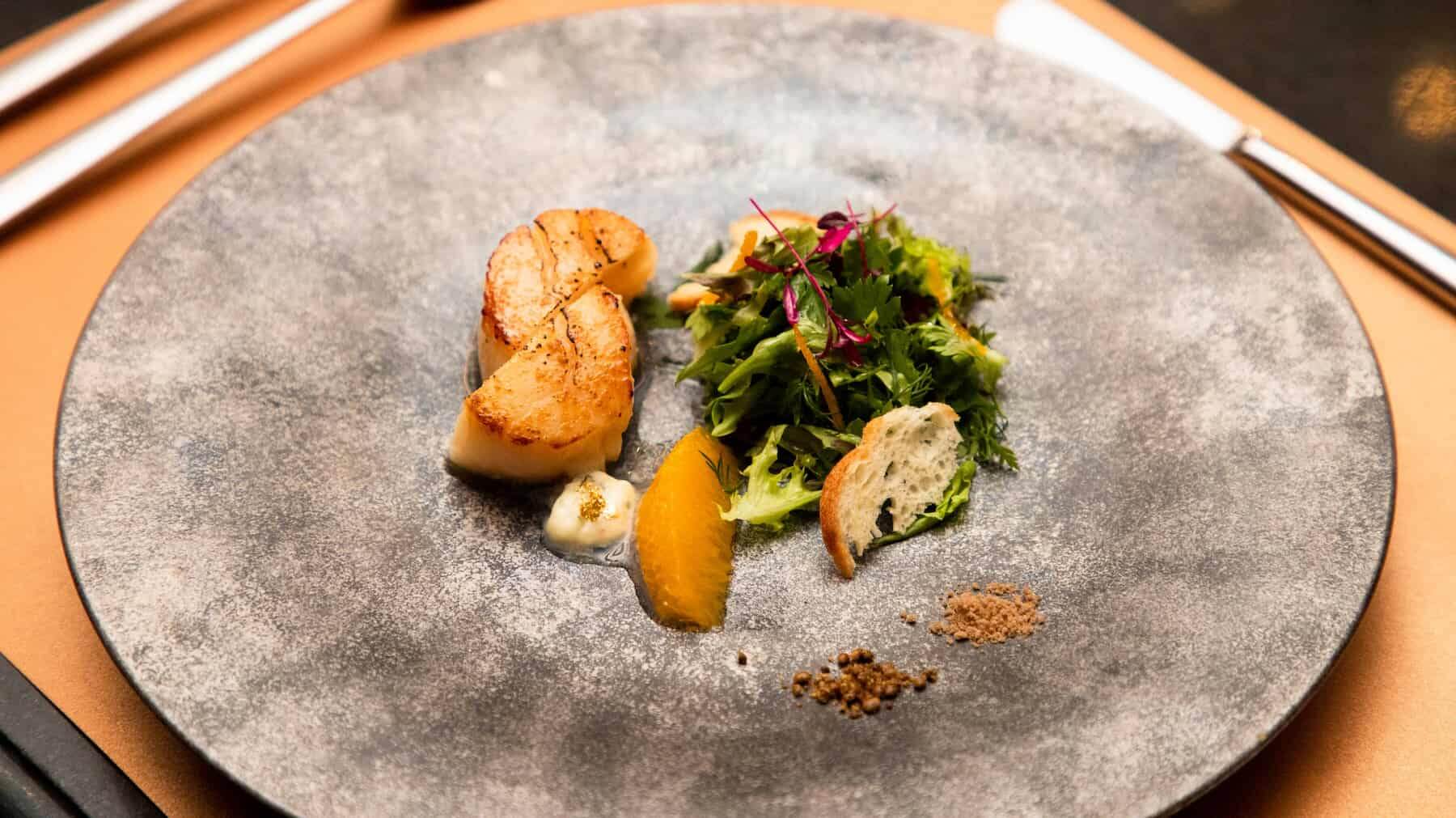 由ROBIN’S牛排館主廚蔡明哲打造的「ROBIN’S 晶選鹽套餐」,共有四道菜式:前菜「北海道干貝.柑橘」選用台東卑南羅氏鹽膚木與屏東海硓鹽——前者其實是一種果實,百年前的原住民因劃界封山政策,只得就地取材、獲取鹽份,其遂採用有如山楂般鹹酸滋味的羅氏鹽膚木果實調味,傳承至今成為一種特殊的調味鹽。後者則是來自國境之南的珊瑚礁岩洞,其尾韻帶有海藻香氣,讓干貝鮮甜層次更豐富。