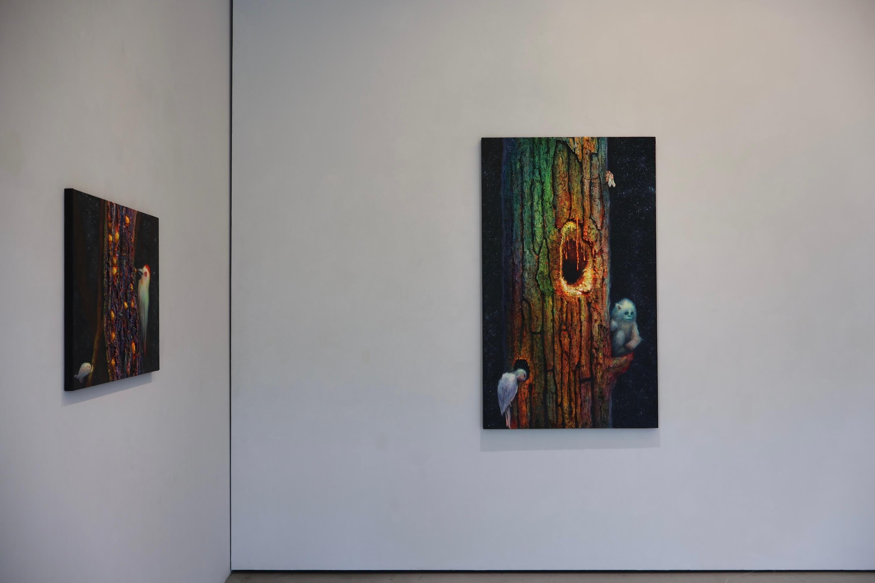 三位藝術家之中,Lee Anon的創作語言最為隱喻而神祕。她的創作致力於反思生命循環,曾受邀赴美國好萊塢Hamilton-Selway畫廊參與聯展。她在畫布上構建了一個充滿隱喻的視覺舞台,神祕森林裡棲息著一群缺乏黑色素的「白化症」動物,既脆弱又神聖。Lee Anon刻意以粗獷有力的筆觸碰撞極其微小的細節,讓那些看似破碎的記憶碎片在畫面上演化為一種共生的姿態,訴說著生命在傷痛之後如何重新找到團結與再生的力量。