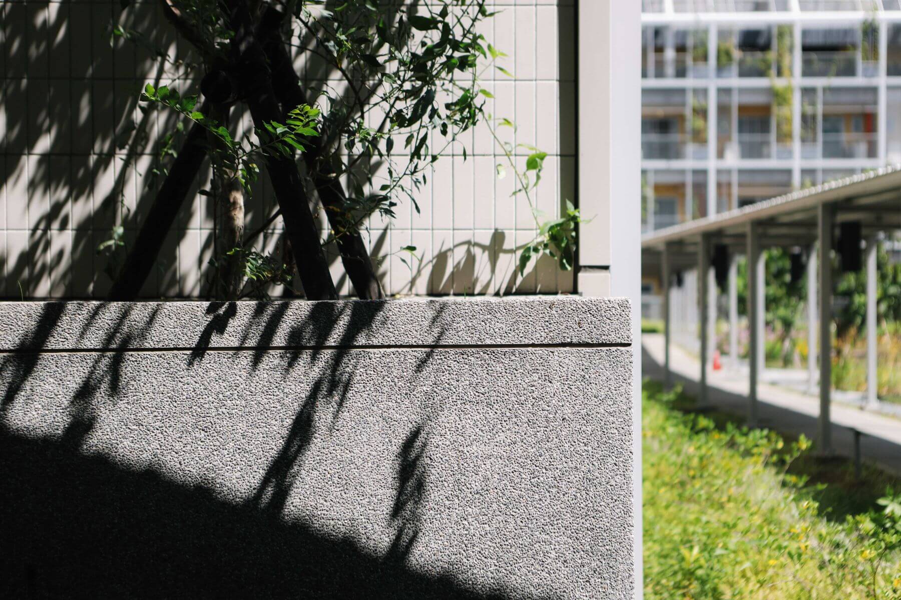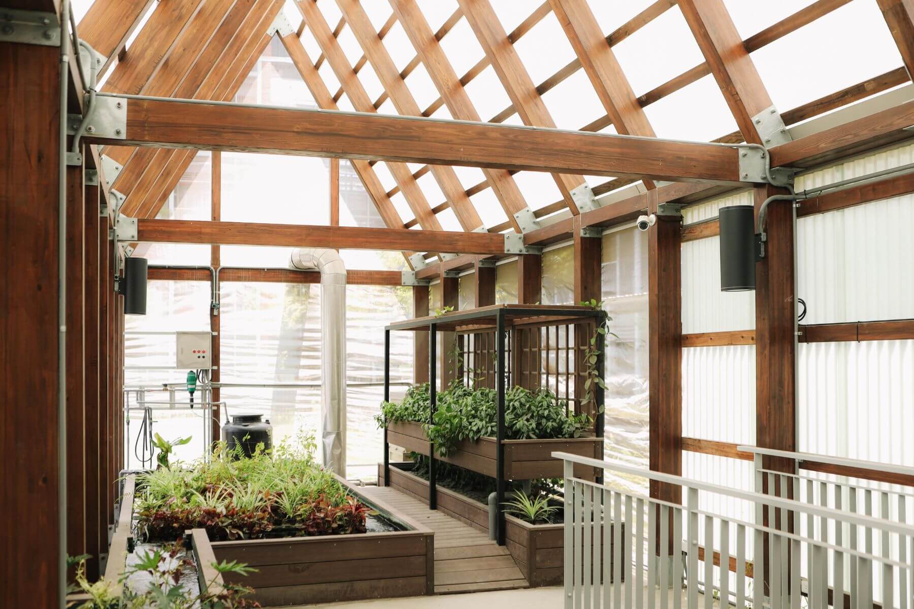 走在聚落中庭,用空橋兩兩銜接的建築,在每層樓創造出 L 型的小街道,而棟與棟之間保持舒適距離,也讓道給南方吹來的風,使之可以吹入中庭、穿入廊道,創造舒服的微氣候,加上循環水系統的生態池,滋潤了原為旱田的壤土,造就了一半休憩、一半生產的地景設計。在中庭一塊一塊的「田」中央,則有一座用波浪板與紗網建造的溫室,裡頭是結合水循環系統的魚菜共生農場,一旁有分解廚餘為肥料的黑水虻養殖箱,運用循環概念設計的都市農園,實現人們在都市裡的田園夢。