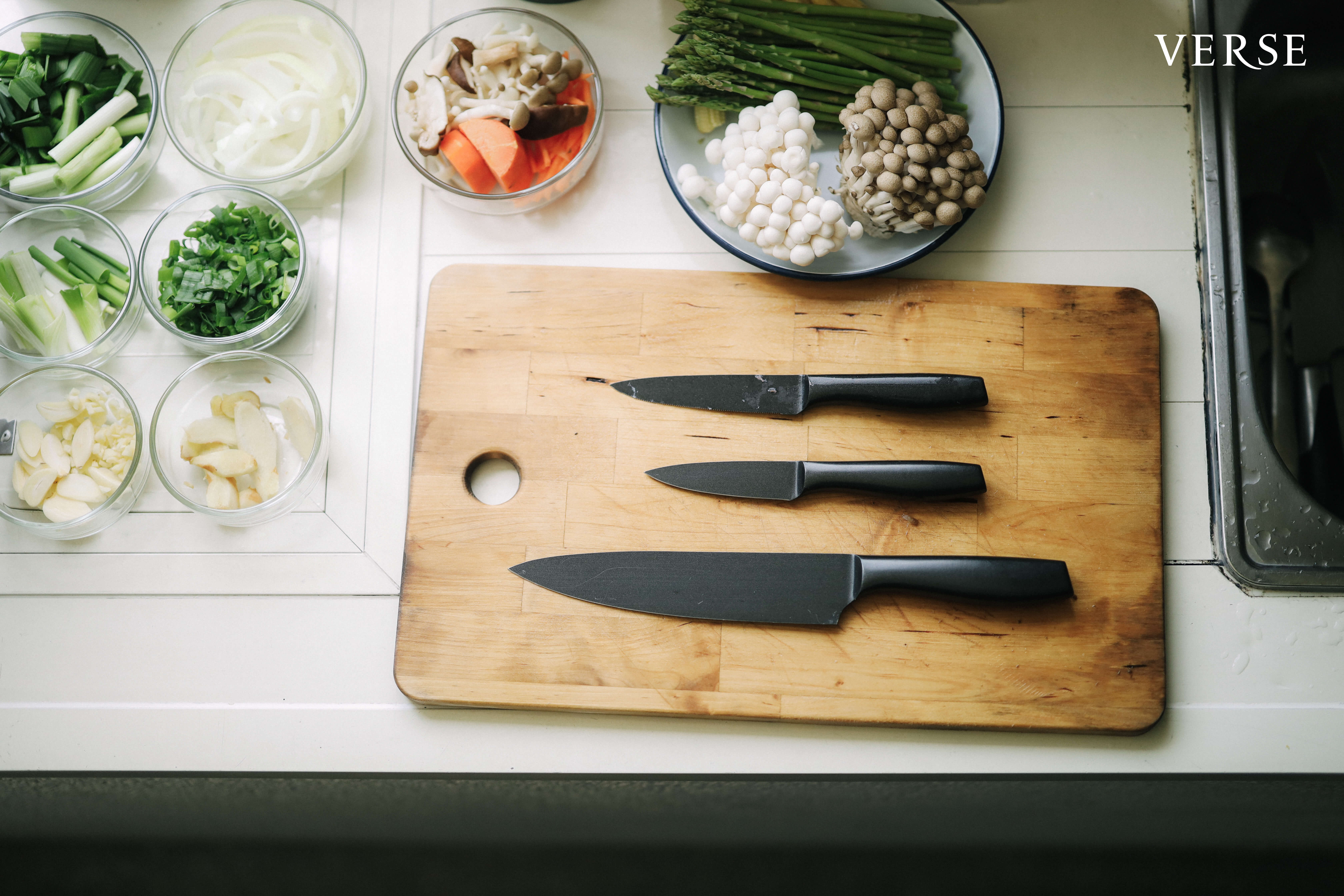 談起最愛的廚具,Rex選擇了一體成型的黑白色刀具,不僅是出於實用考量,也與他的設計美學相符。「我喜歡直接觸摸產品的材質,不只是廚具,連手機我都不用保護殼。」他特別偏好全鋼一體成型的設計,無接縫的刀身既俐落美觀,也能減少藏汙納垢的可能,讓清潔變得更輕鬆。「好的刀具握感很重要,重量要適中,刀鋒鋒利才能讓切菜的過程更順手。」對他而言,廚房工具是烹飪的輔助,更是展現設計品味的選物。