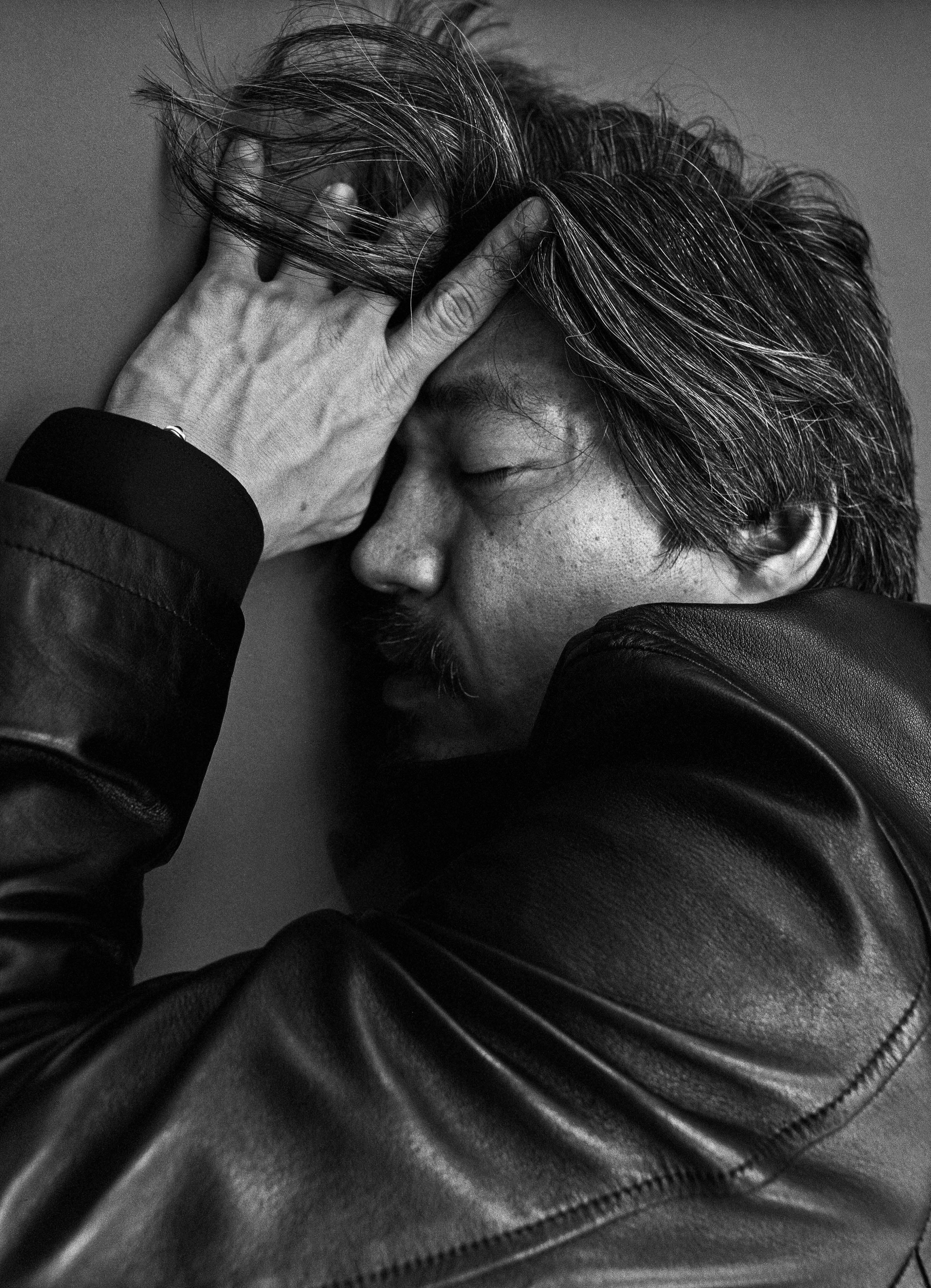 拍攝現場氛圍輕鬆自在。在簡潔的背景下,坂本龍一很快進入自己的境界——時而直視鏡頭展現銳利眼神,時而躺臥地面流露隨性一面,甚至與攝影師的寵物狗親密玩耍。整個拍攝過程猶如一場即興演出,瀟灑而迷人,Rensis巧妙捕捉了他的不同神韻。