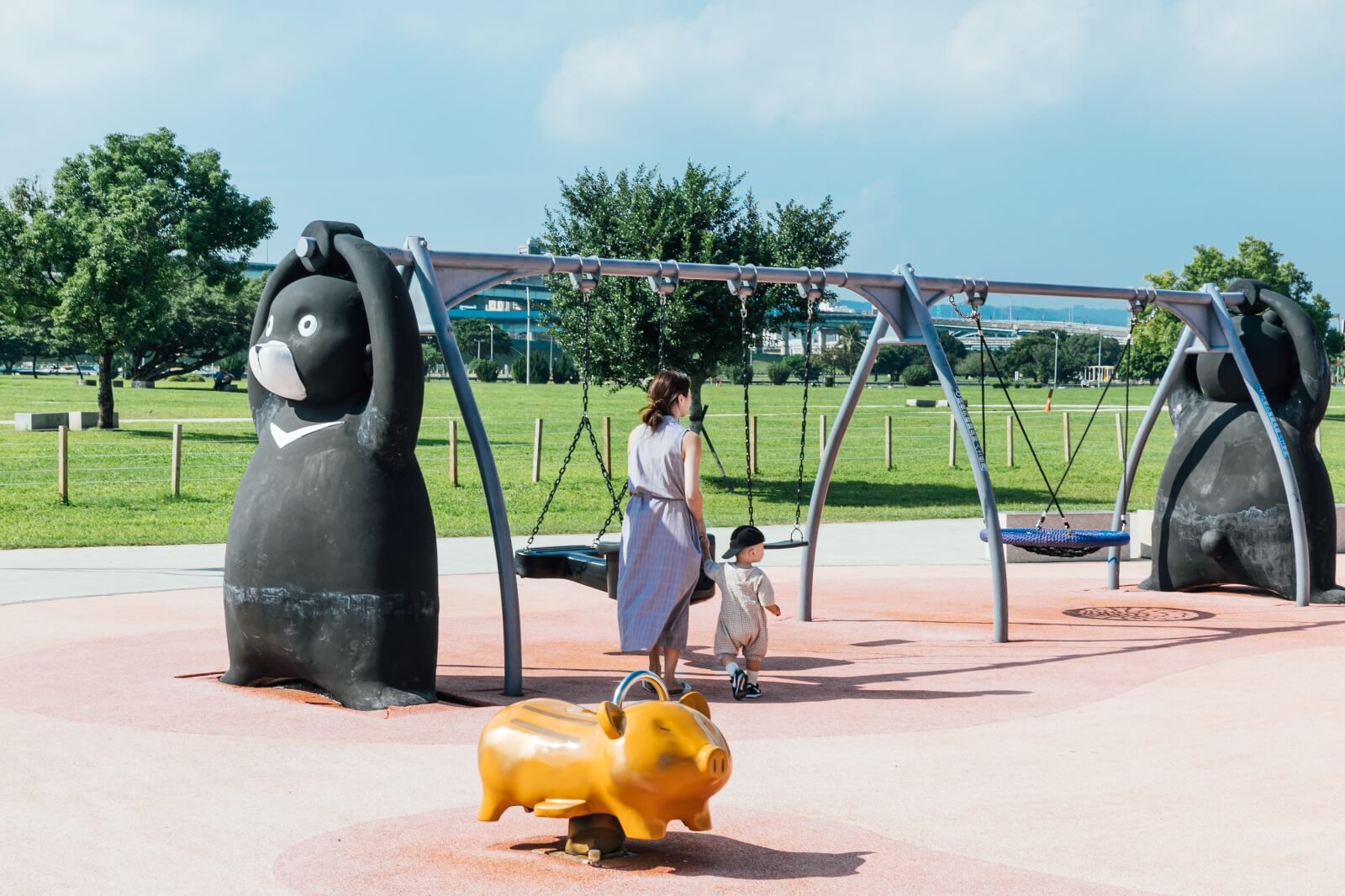 尤其在辰光橋與中山橋之間堤防上的「熊猴森樂園」,以台灣特有種生物為主題,結合動物可愛版形象的地景設施,讓公園遊具脫離一成不變的外貌,幻化為動物形象,草坡成為滑梯,大人小孩都能在台灣帝雉、櫻花鉤吻鮭、台灣黑熊、台灣雲豹身上玩耍,孩子盡情撒野「放電」,大人則解放久違的童心。