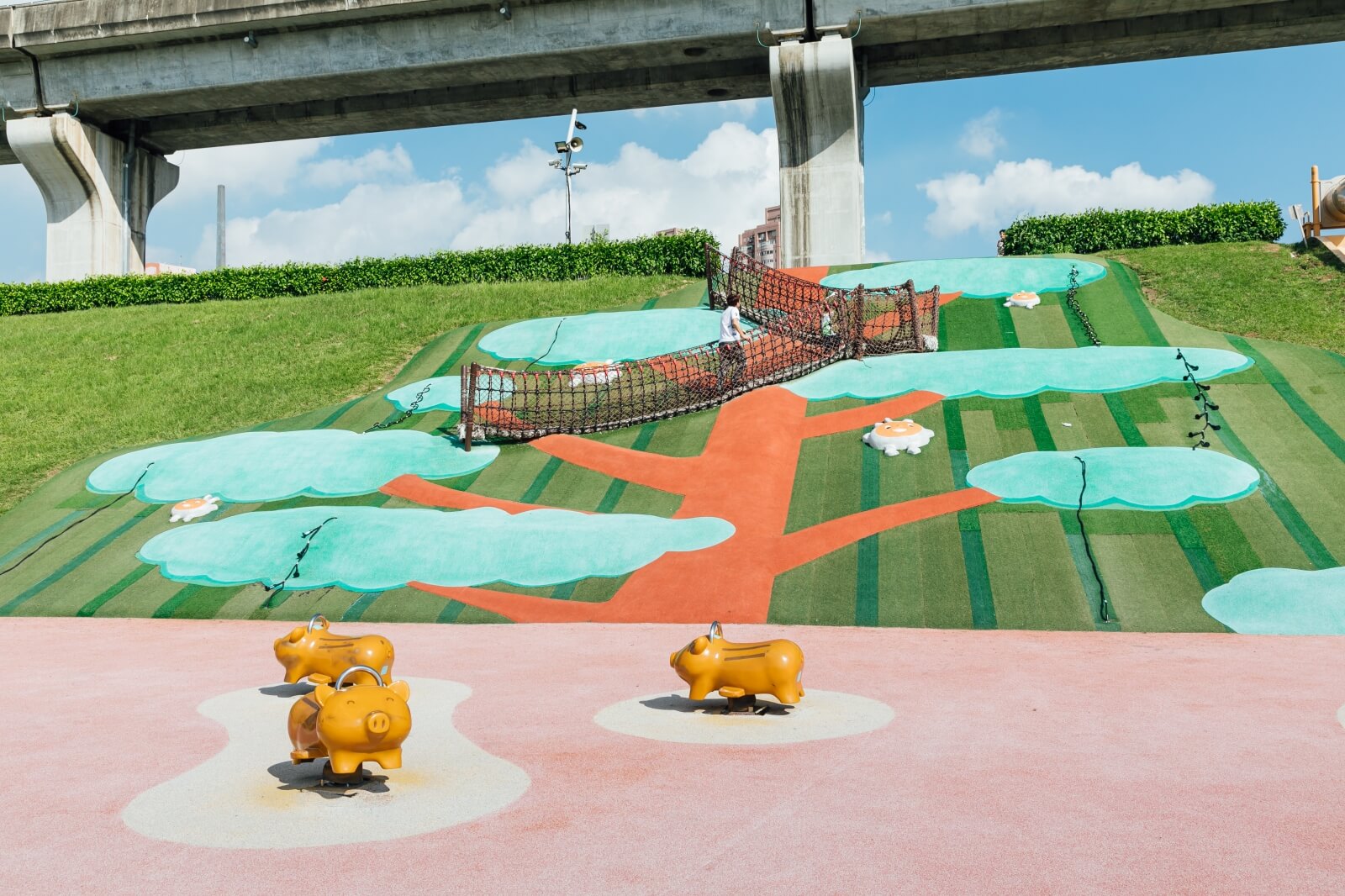 這一整片似無盡頭的河堤樂園,兼具安全、寓教、休閒、運動多種功能,並免受汽機車打擾。長者悠閒散步、乘涼,進行身心舒展;孩子能與玩伴在遊戲沙坑集合,或者蕩起鞦韆,穿梭迷宮與大型管道遊具間,將一期一會的童年友誼,延長為社區小夥伴的不定期童樂集會。