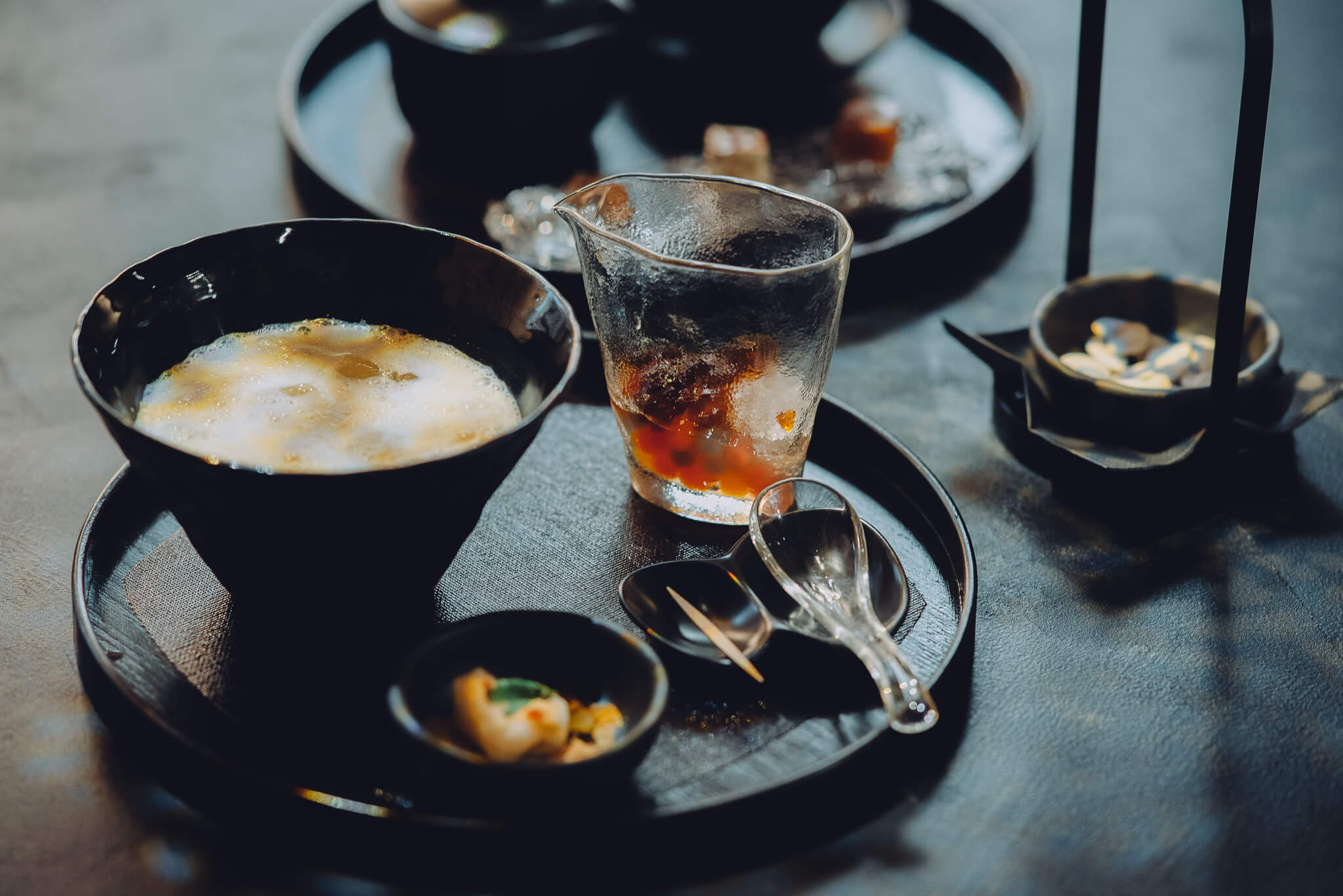 店面空間的土黃色象徵著滋養漢方食材的黃土,襯以東方的筆墨黑為空間主要視覺色系;在器皿選擇上,Van更親手捏製恰好貼合手掌心弧度的茶碗,致敬早期台灣庶民攤車以手捧茶的喝法;而店中央蘭花栽培遮陽網下,有別於一般店家以2人為單位的座位安排,有著一張可容納16人的長桌,其中更藏有Van的特別用意。