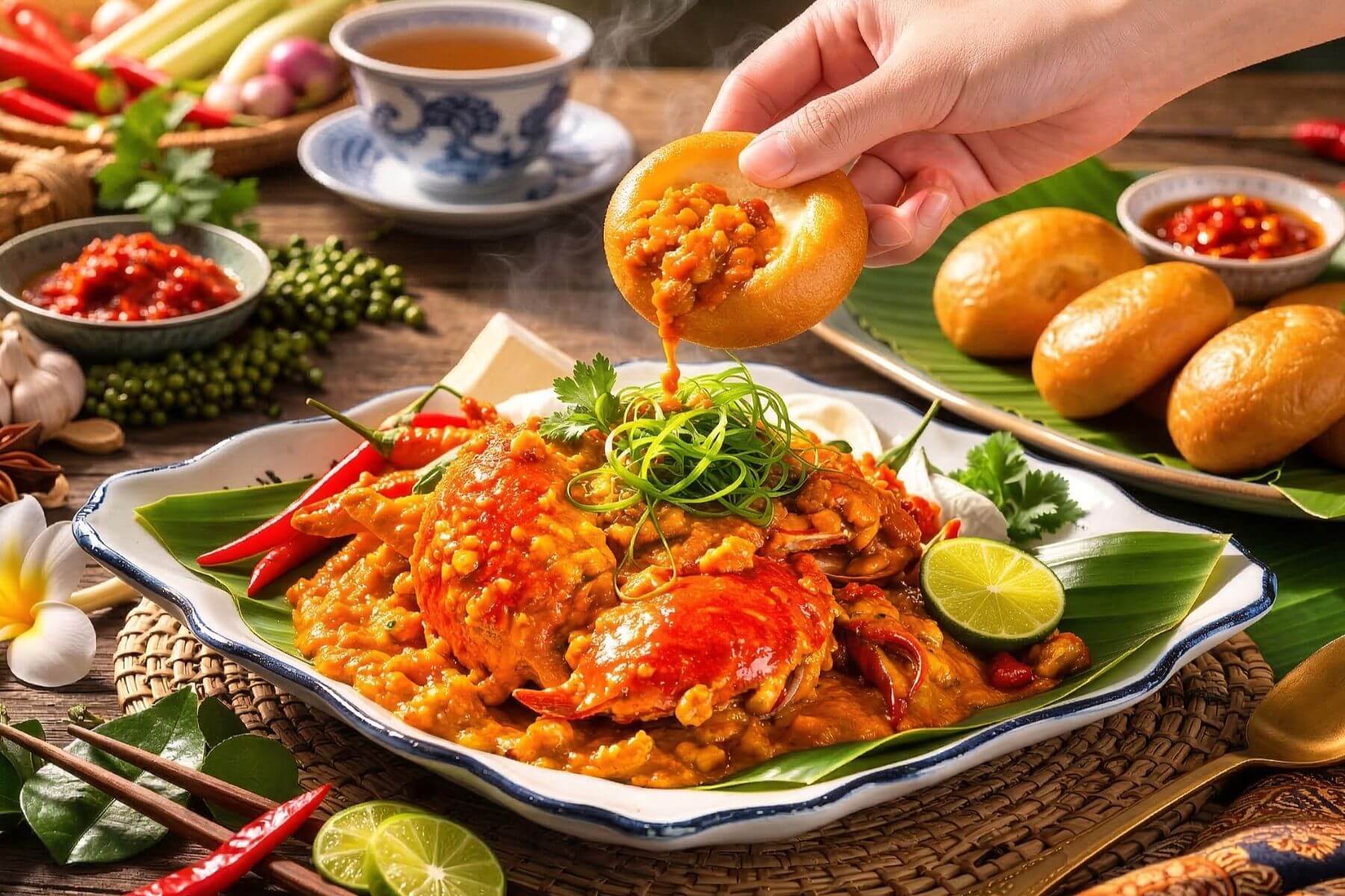 新加坡辣椒蟹:名震星洲的國寶級美味,碩大肥美的蟹肉與獨門酸辣醬在高溫火舌間迅速翻炒 。入口先是辛辣勁道,隨即番茄酸香與滑順蛋絲交織,搭配金黃炸饅頭沾裹濃縮海味精華 。